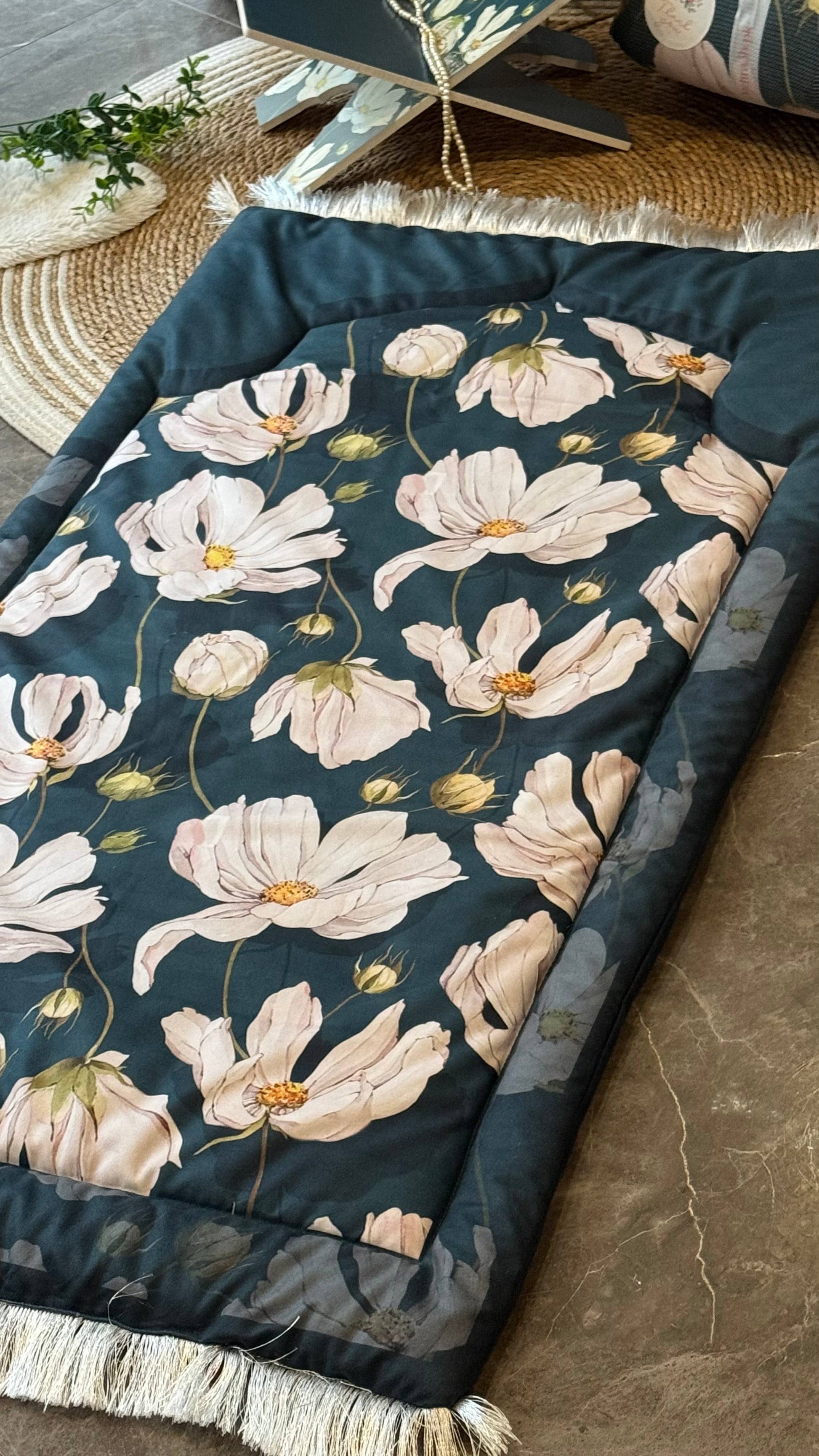 The customized large prayer mat is crafted with premium quality materials, offering exceptional comfort and ample space for prayer. Personalization adds a special touch, making your ibadah even more heartfelt. The matching Rehal enhances your Quran recitation, while the tasbeeh and bookmark, designed in the same elegant style, complete the set beautifully.