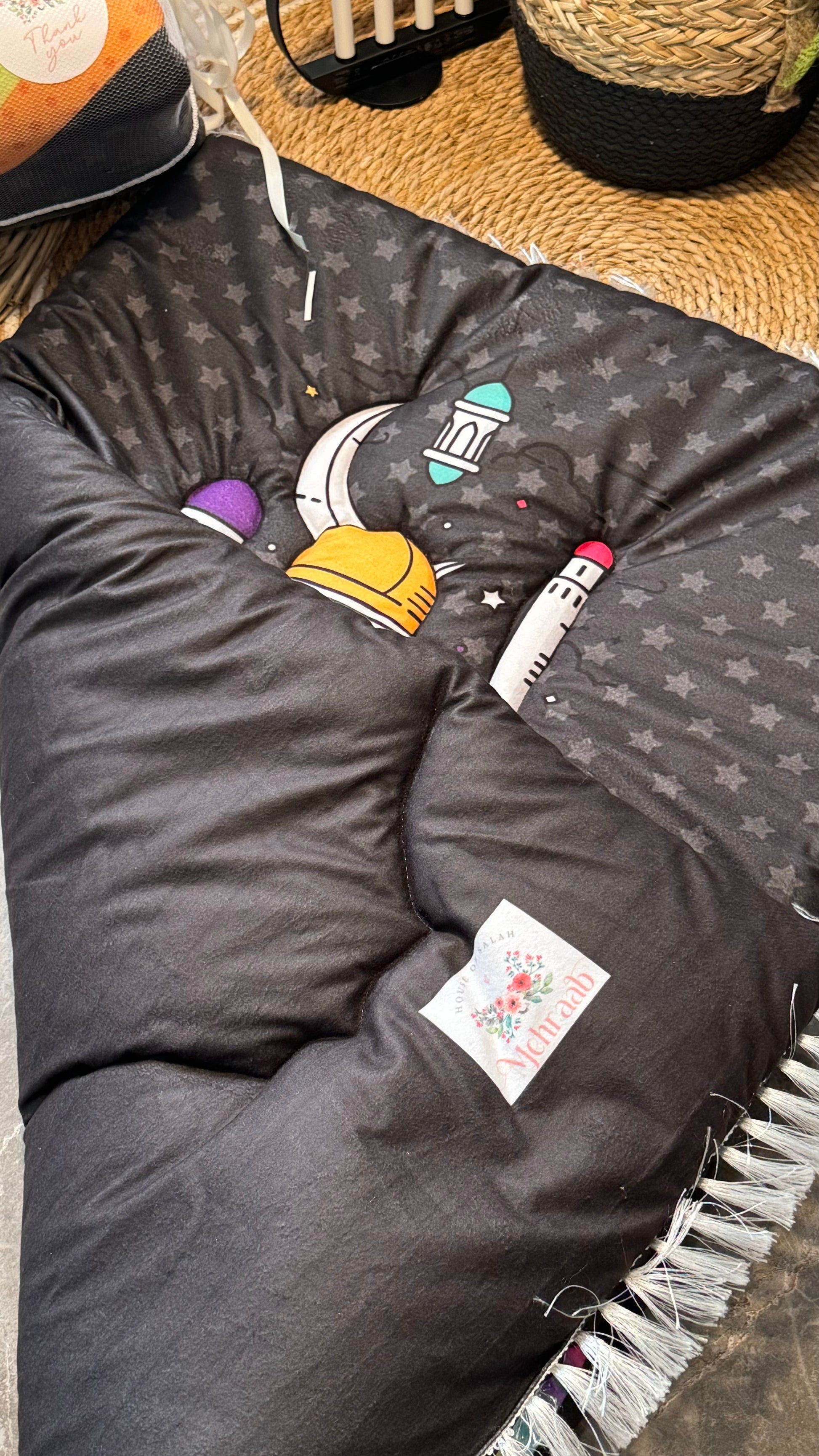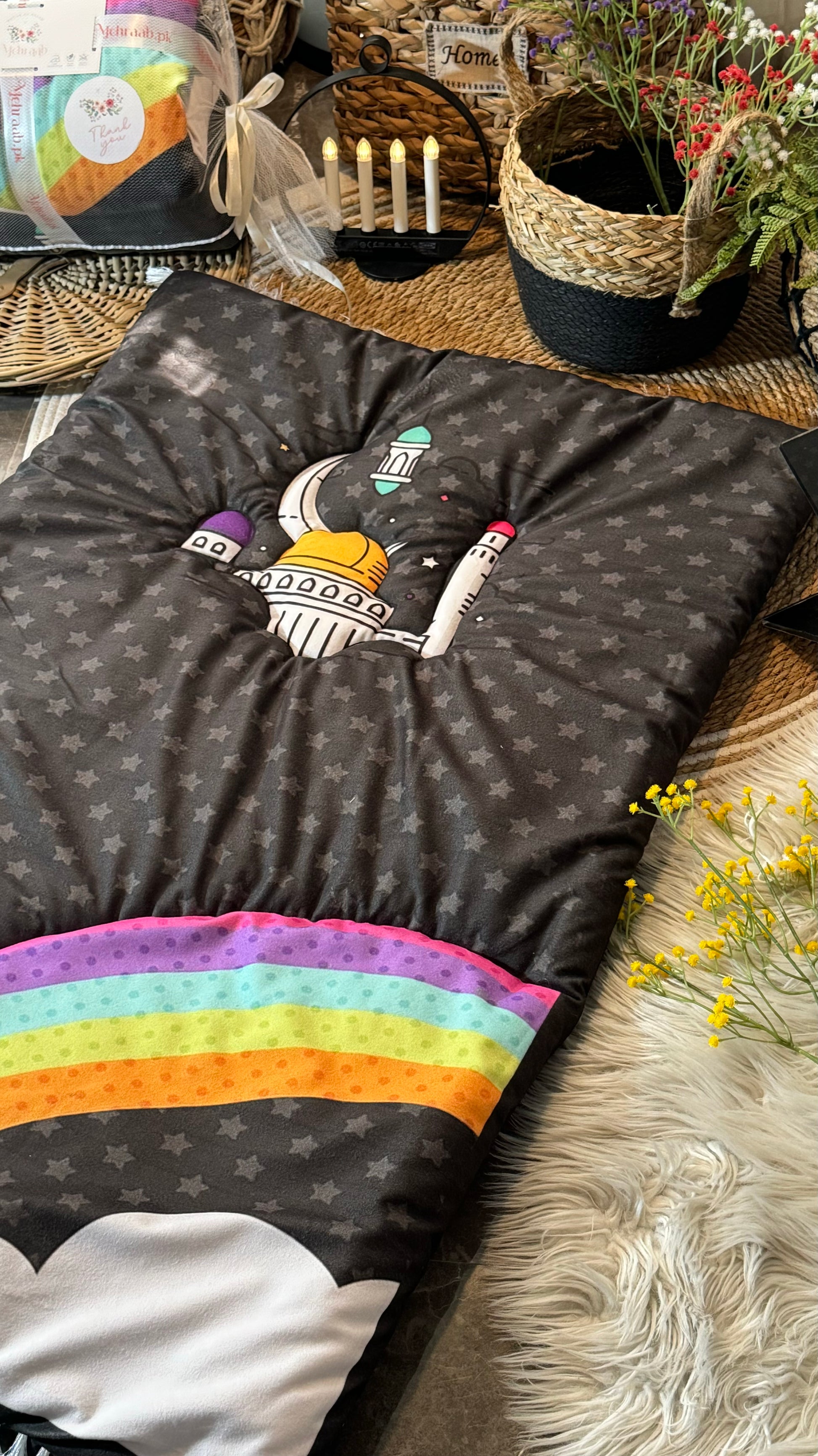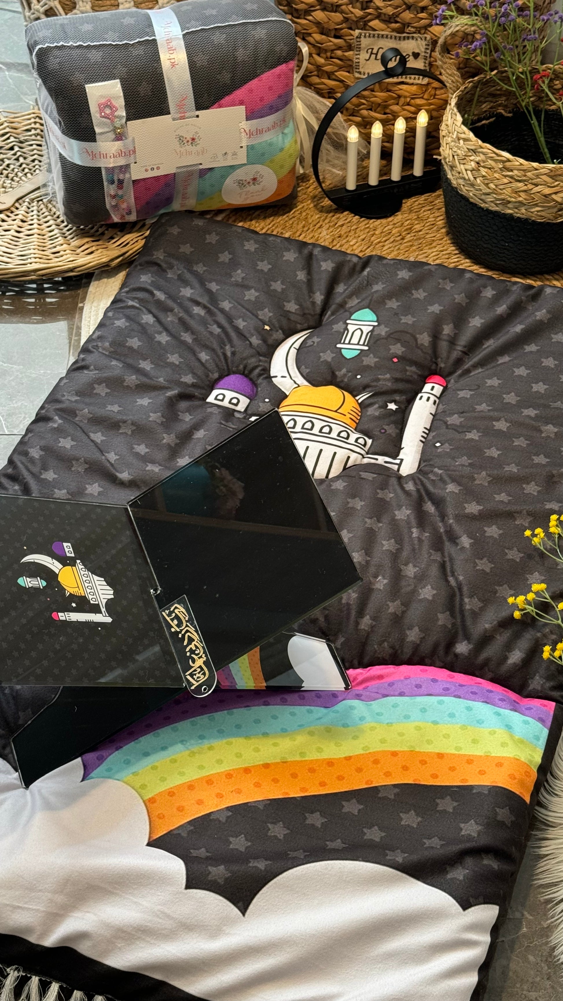 Discover the perfect black kids’ prayer mat at Mehraab.pk, designed with care to encourage children in their spiritual journey. Made from premium imported Korean velvet, this high-quality Islamic prayer rug features a vibrant mosque, stars, and rainbow illustration, creating an inviting atmosphere for young minds. With a large size suitable for kids up to 15 years old, 300 grams of plush polyester filling, and durable high-quality stitching, this prayer mat ensures comfort and longevity. Ideal as an Islamic gift, Eid present, or Ramadan gift for kids, this prayer mat helps nurture a deep connection to faith. Perfect for daily prayer, it’s a unique Islamic product that combines comfort, beauty, and functionality, making it a must-have for any young Muslim’s prayer space. Explore our exclusive collection of kids’ prayer mats, Islamic gifts, and educational products at Mehraab.pk.”