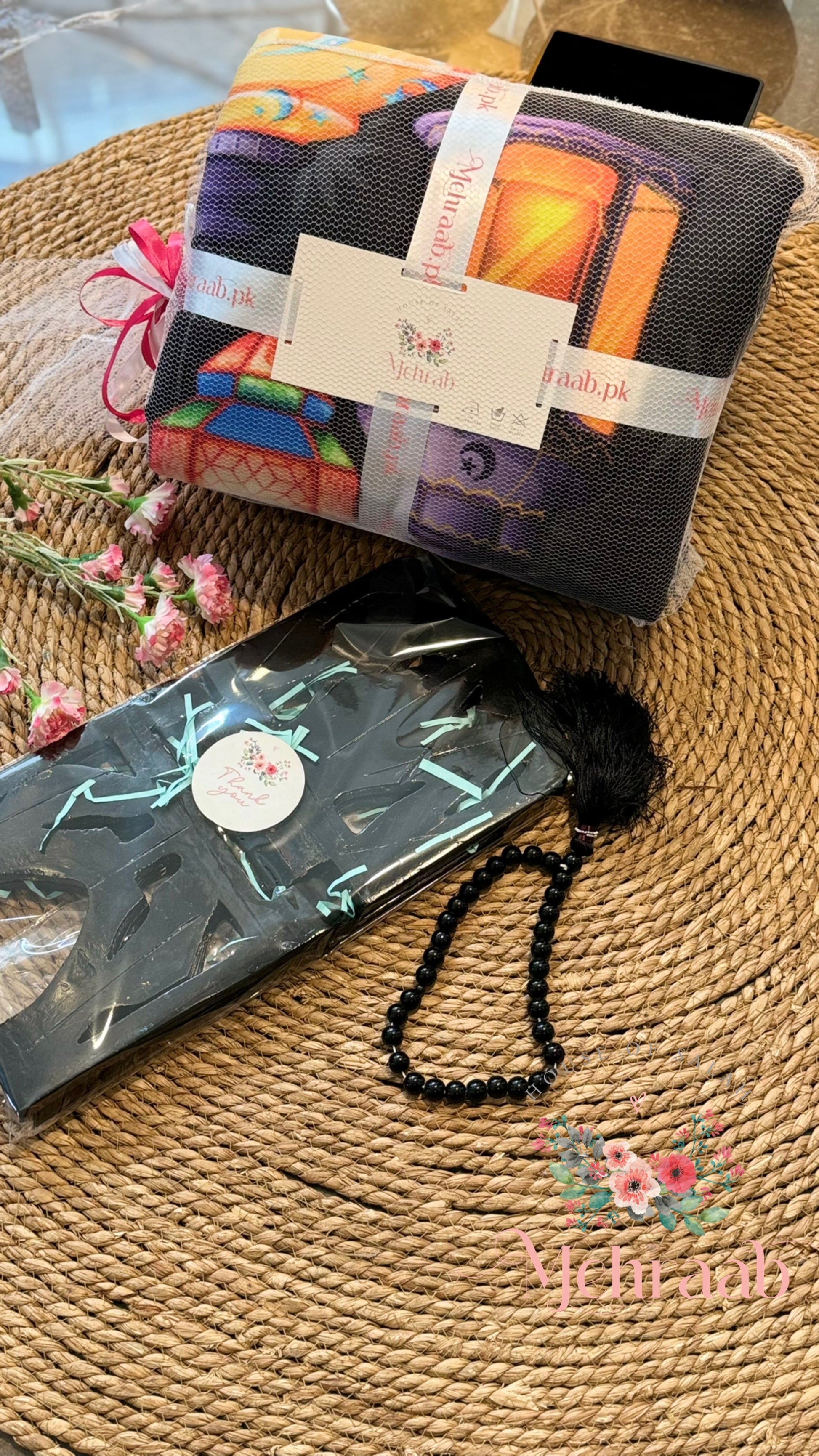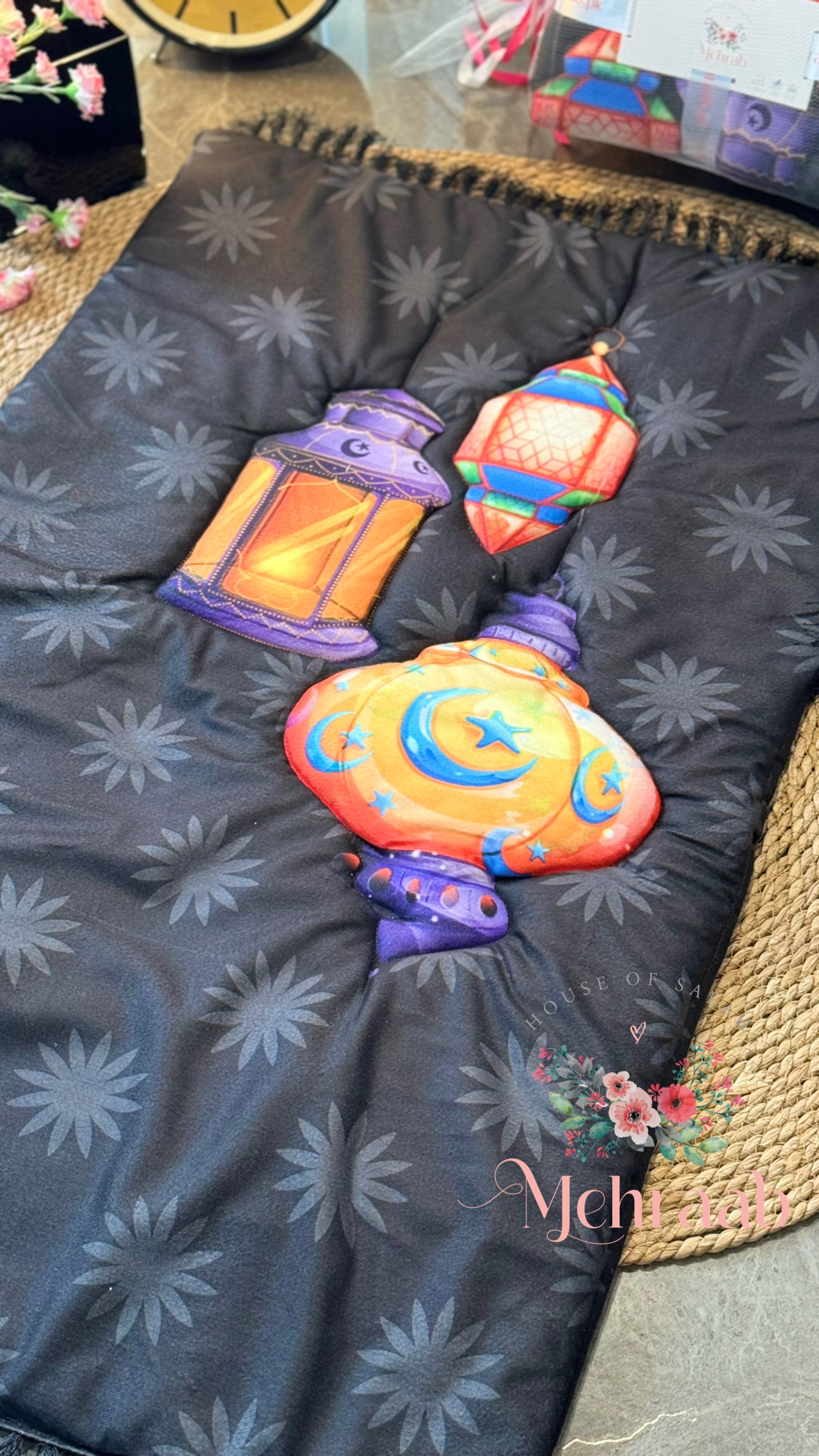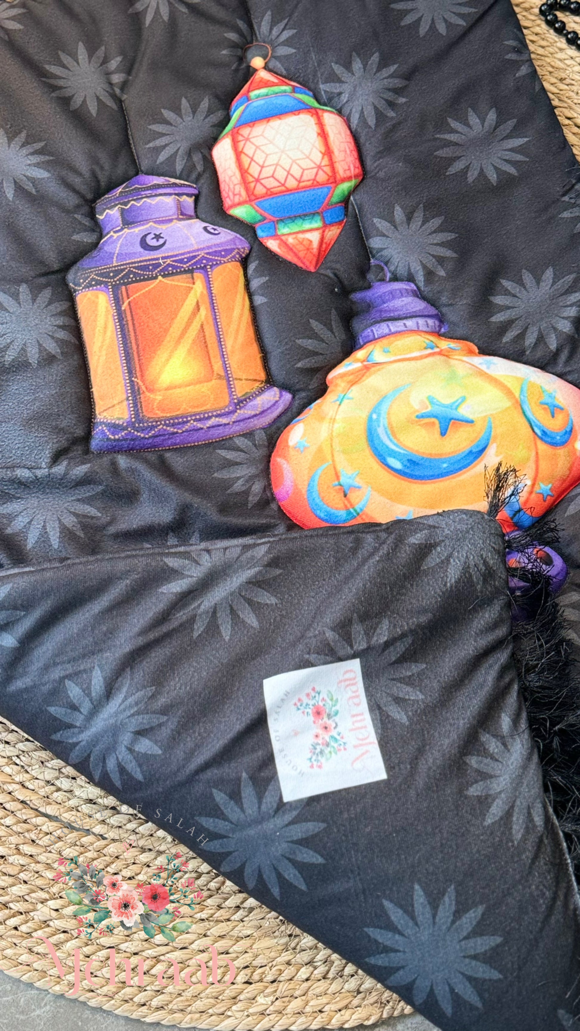 K20:Black prayer mat with colorful lanterns