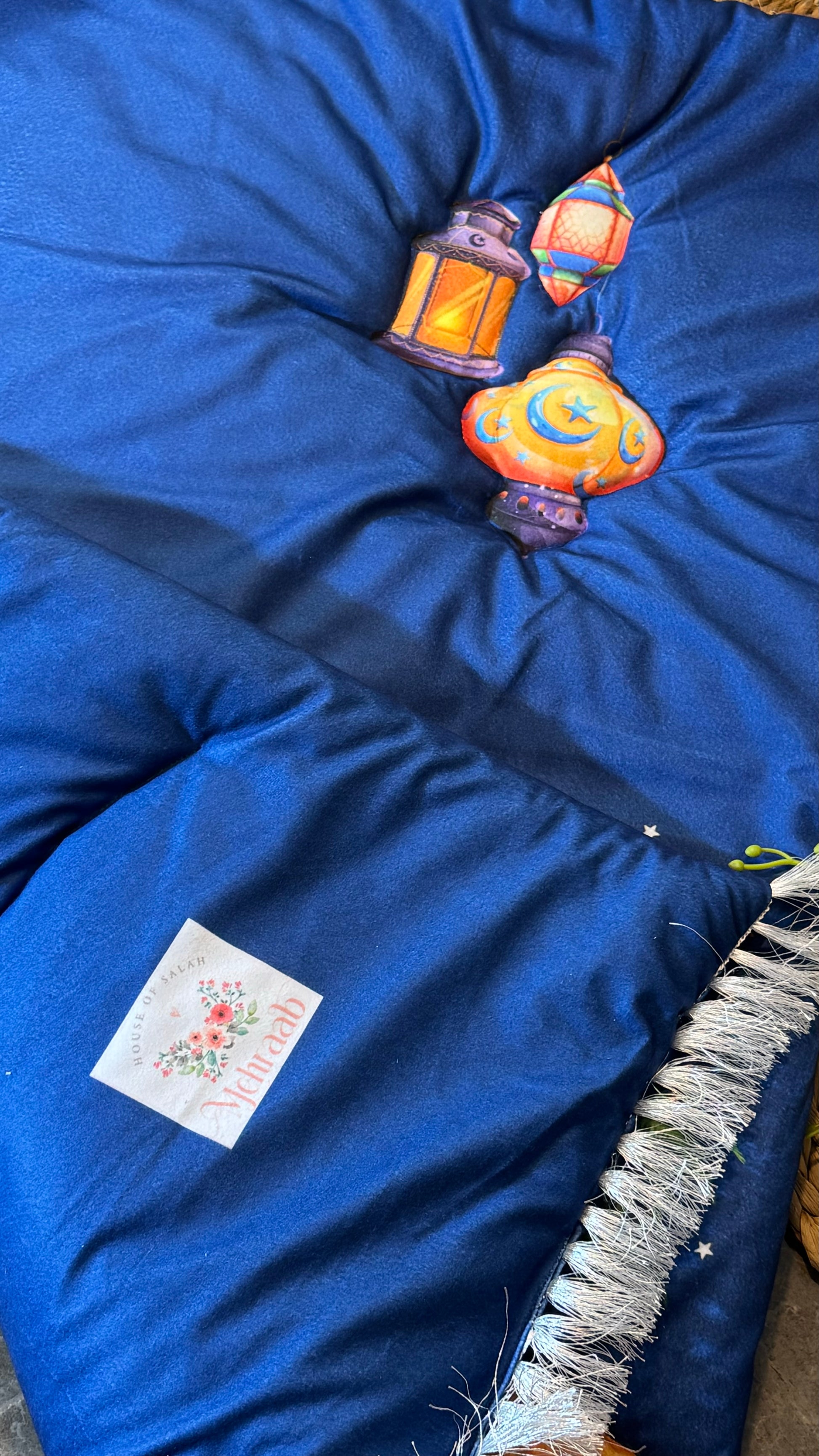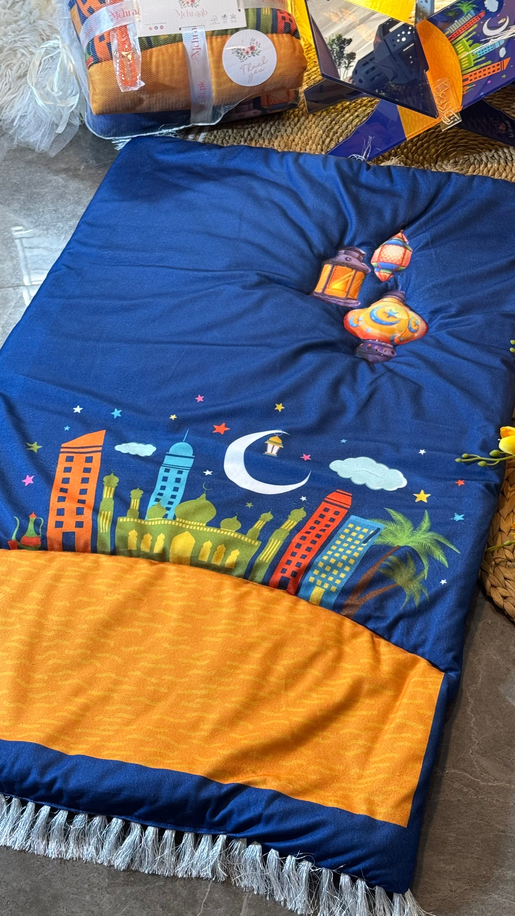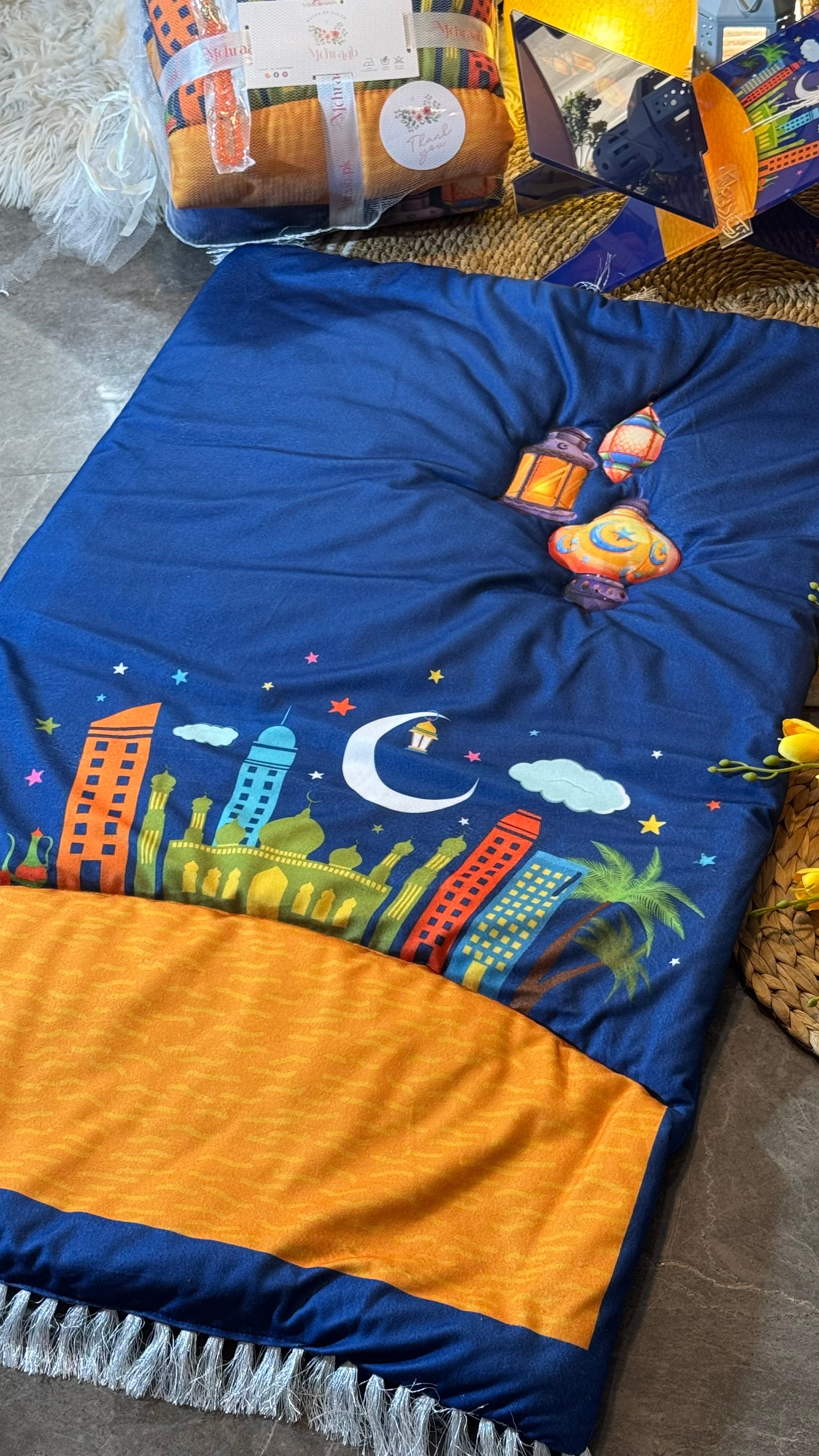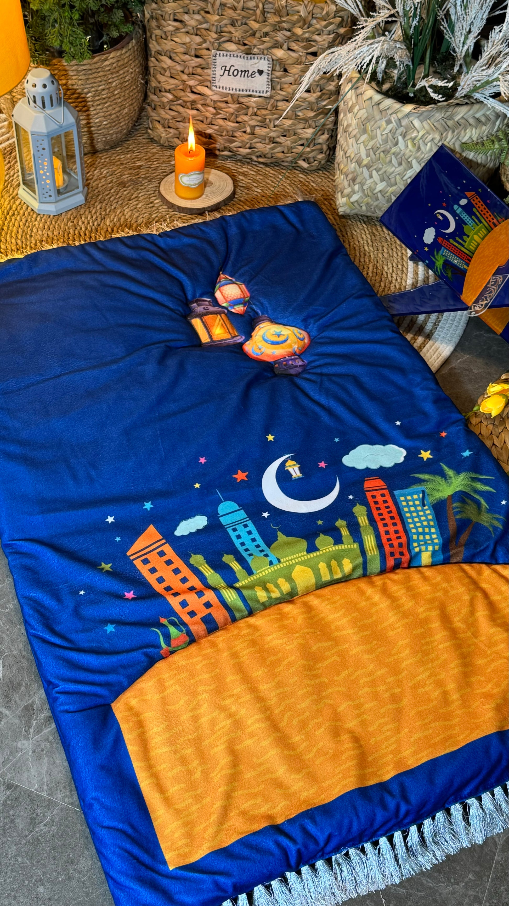 Starlit City Serenity Jayenamaz– The perfect blend of comfort, durability, and Islamic artistry to enrich your child’s prayer experience. Crafted with premium imported Korean velvet, this luxurious jayenamaz ensures a soft and soothing touch, making it ideal for extended use. The vibrant navy blue design features a lively cityscape illuminated by lanterns, a crescent moon, and stars, sparking a sense of connection to Islamic traditions.