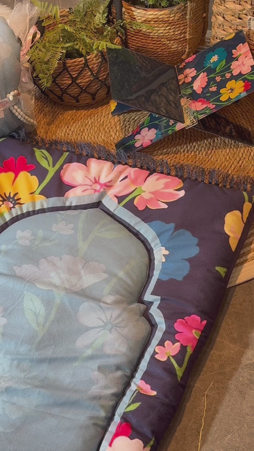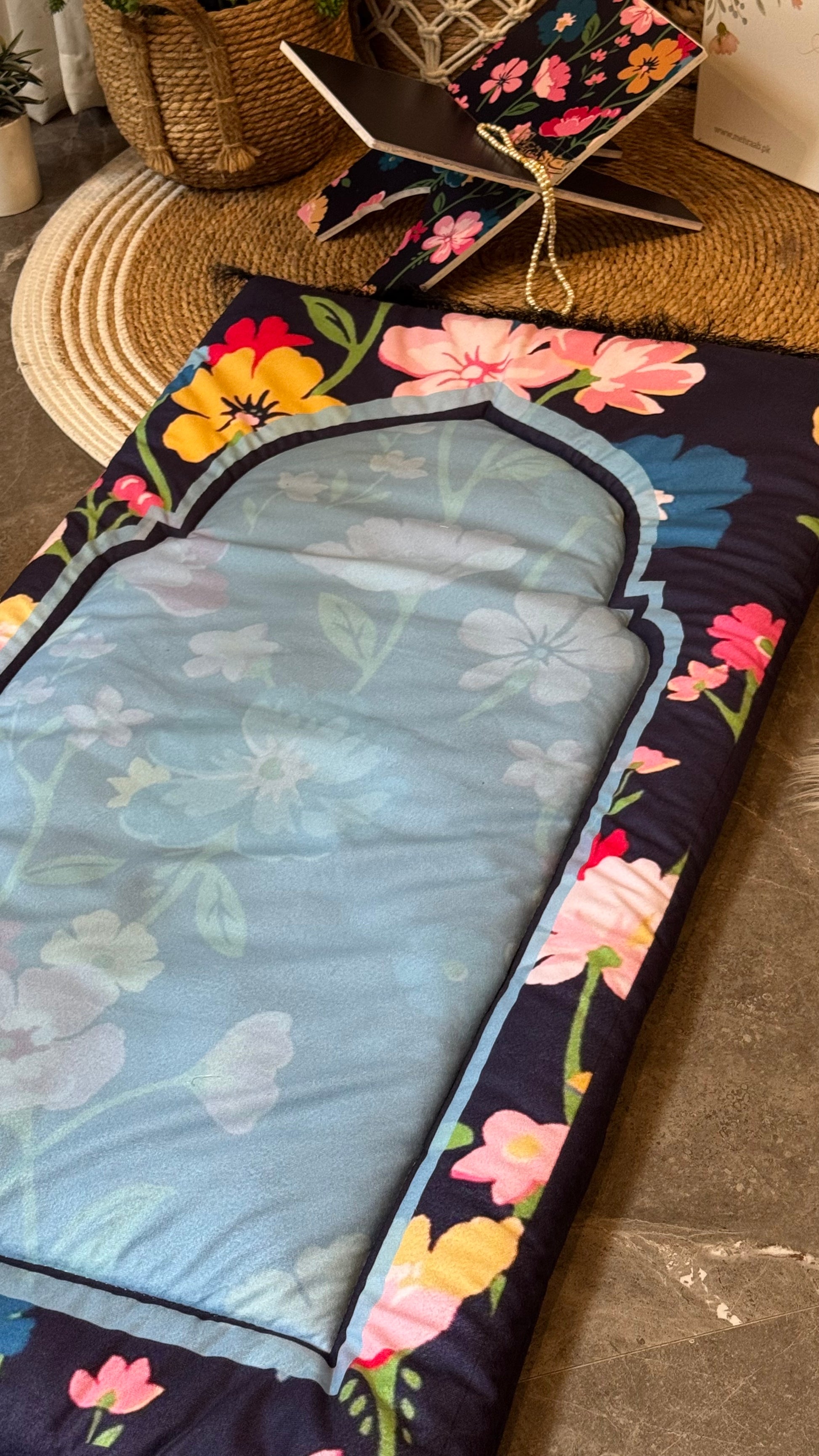 Introducing the Floral Serenity Adult Prayer Mat, a harmonious blend of faith and elegance designed to elevate your daily prayer experience. This prayer mat is crafted from luxurious imported Korean velvet and adorned with a soothing sky-blue center framed by a vibrant floral border, representing peace, renewal, and spiritual beauty.