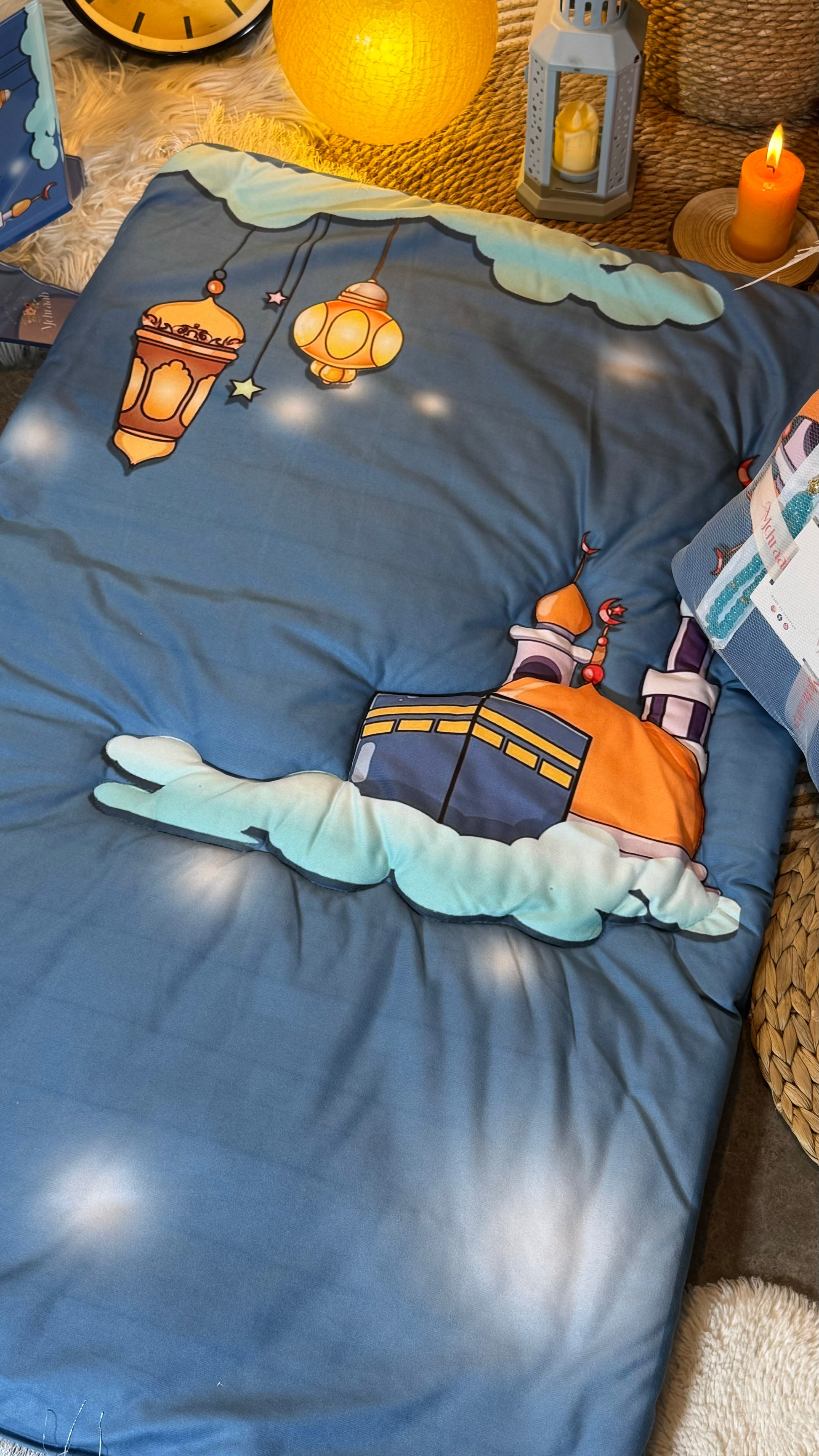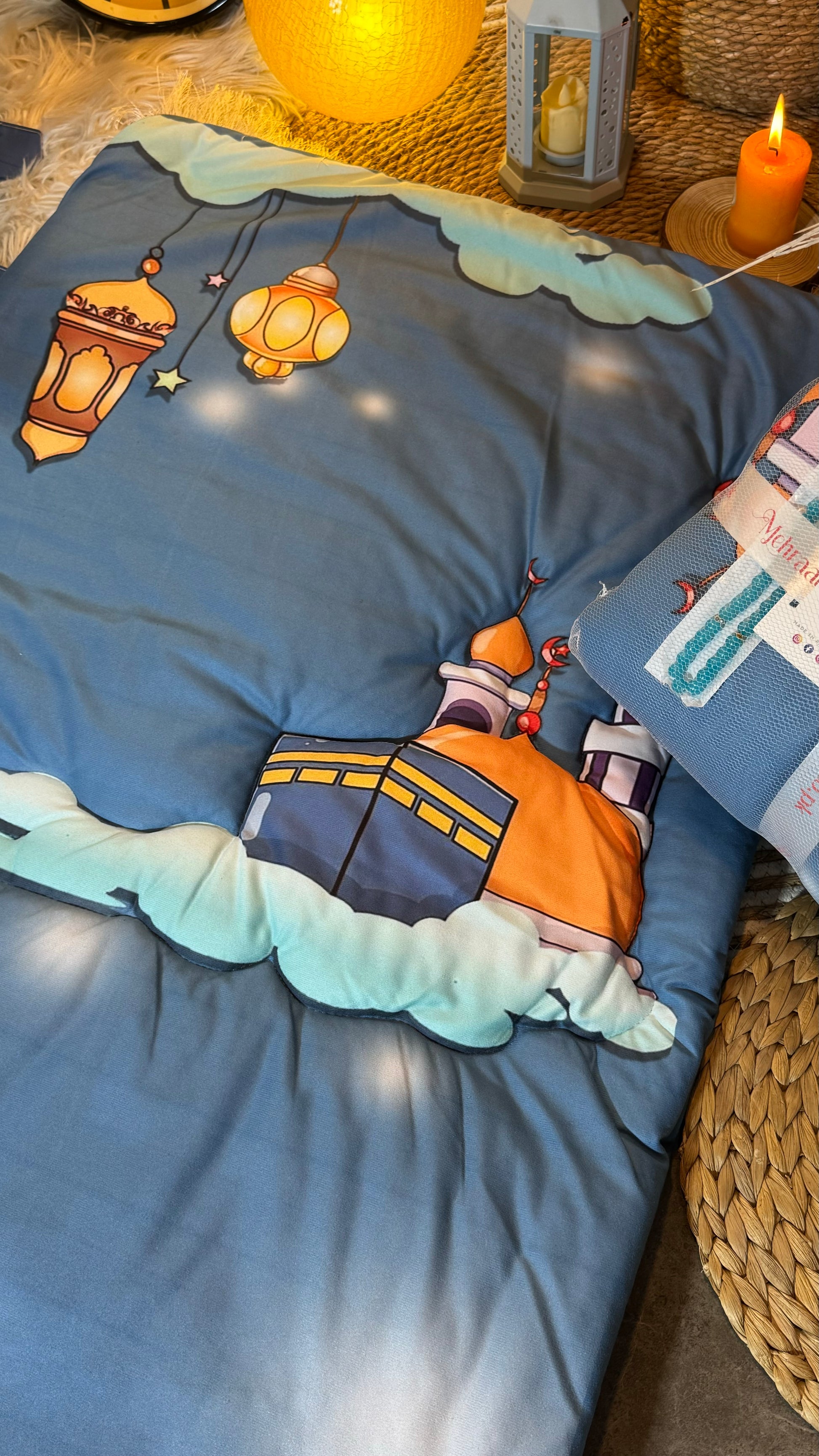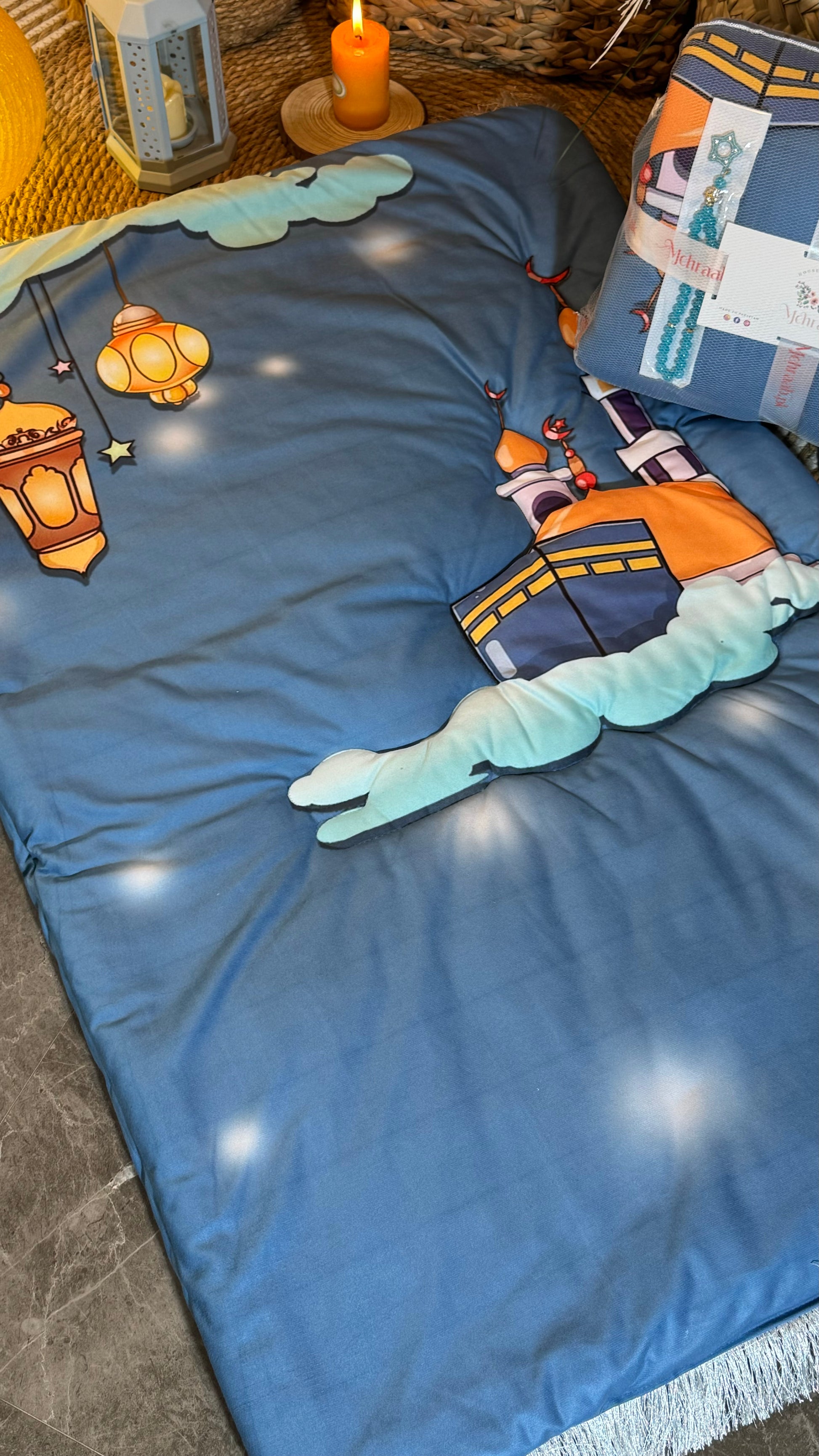 Bring serenity and comfort to your child’s prayer time with the Heavenly Blue Mosque Kids’ Prayer Mat. This stunning mat features a beautifully illustrated mosque and lanterns against a celestial blue backdrop, inspiring a sense of peace and spirituality. Crafted from luxurious imported Korean velvet, this kids’ prayer mat is as soft as it is durable, providing 300 grams of plush polyester filling to cushion every prayer. Designed with high-quality stitching, this mat is large enough to grow with your child, fitting ages up to 15 years old. Each prayer mat also includes a complimentary tasbeeh, adding a thoughtful touch to every purchase. Encourage your child’s spiritual journey with a prayer mat that combines comfort, elegance, and faith. Perfect as a gift or a meaningful addition to your home Heavenly Blue Mosque Kids’ Prayer Mat,’ Prayer Mat is designed to inspire a love for prayer.