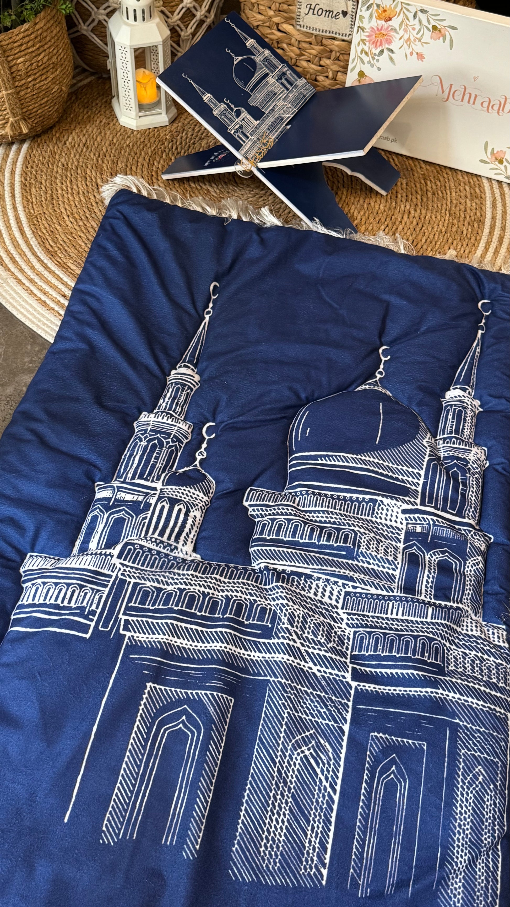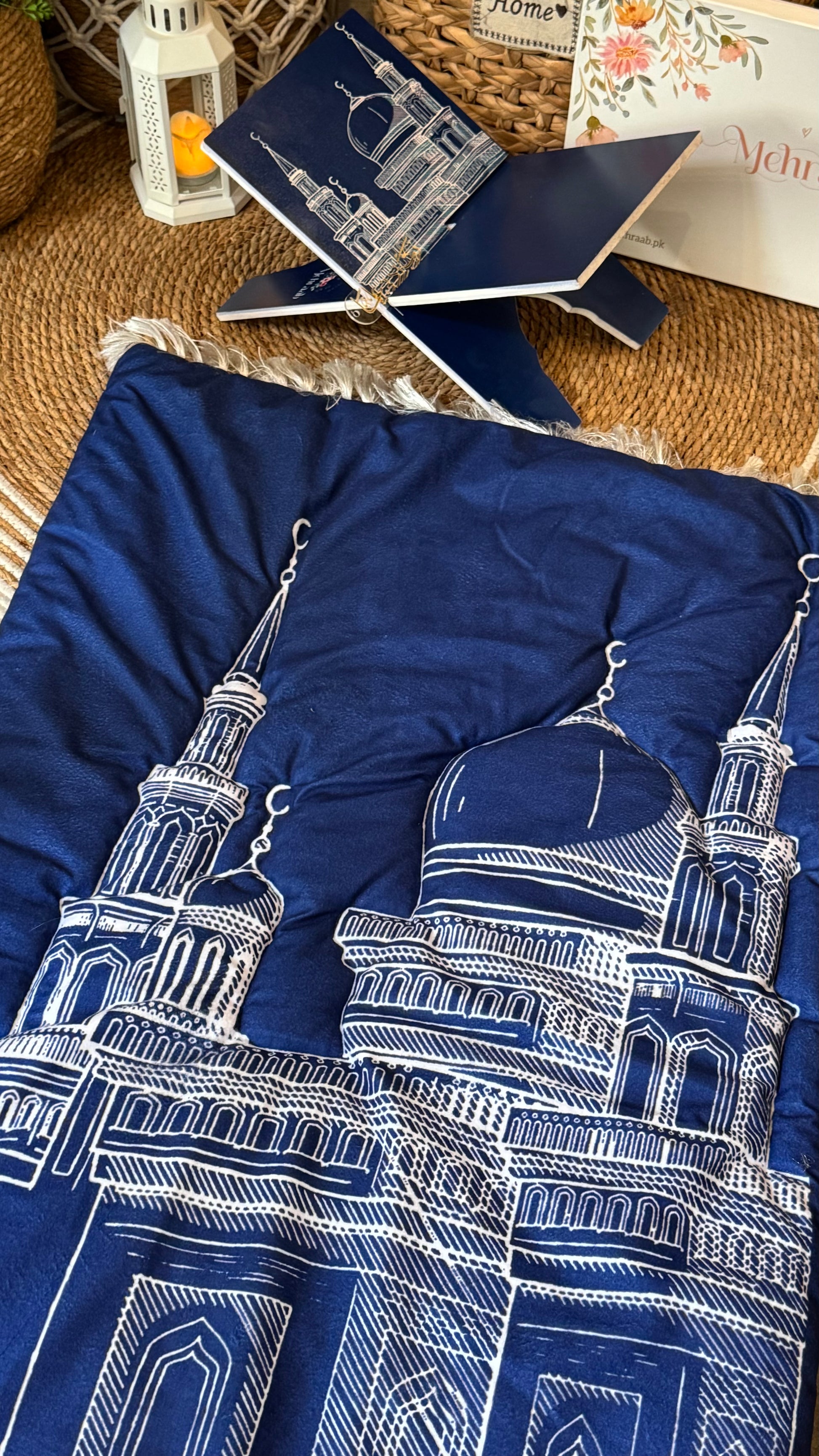 Elevate your spiritual moments with our royal blue Masjid Adult Prayer Mat, a striking addition to our luxury Islamic prayer mat collection. Crafted from premium imported Korean velvet, this black prayer rug features a stunning white masjid illustration, symbolizing elegance and devotion. The detailed mosque architecture with domes and minarets gives it a timeless Islamic aesthetic, making it perfect for both men and women.