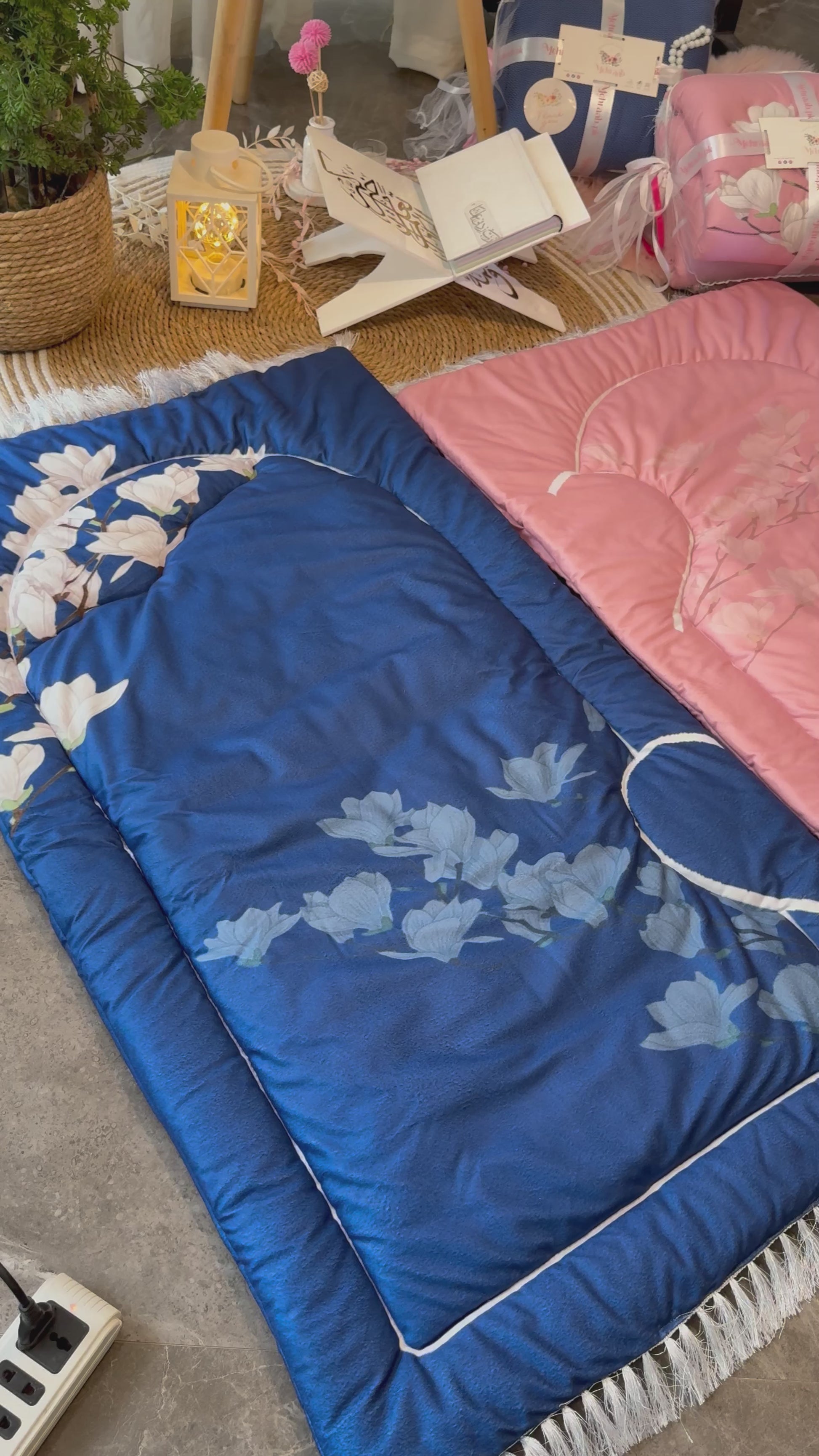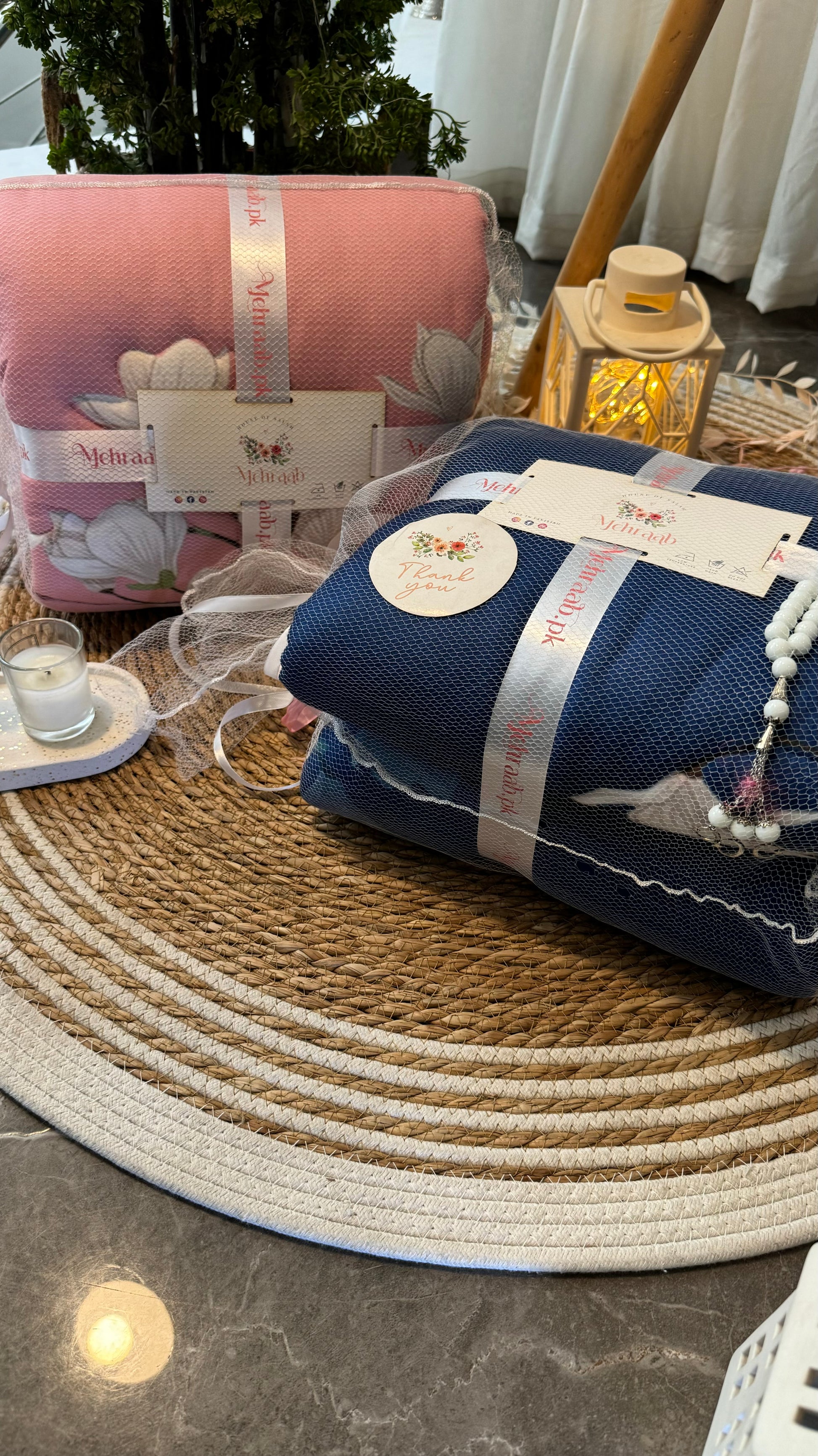 couple prayer mats, available in elegant pink and blue colors. These adult-sized mats feature a beautiful floral print and modern design, crafted from imported Korean velvet with 300 grams of filling. Measuring approximately 26x50 inches, each mat is beautifully stitched and presented in attractive packaging, making them a perfect gift or addition to your prayer routine.