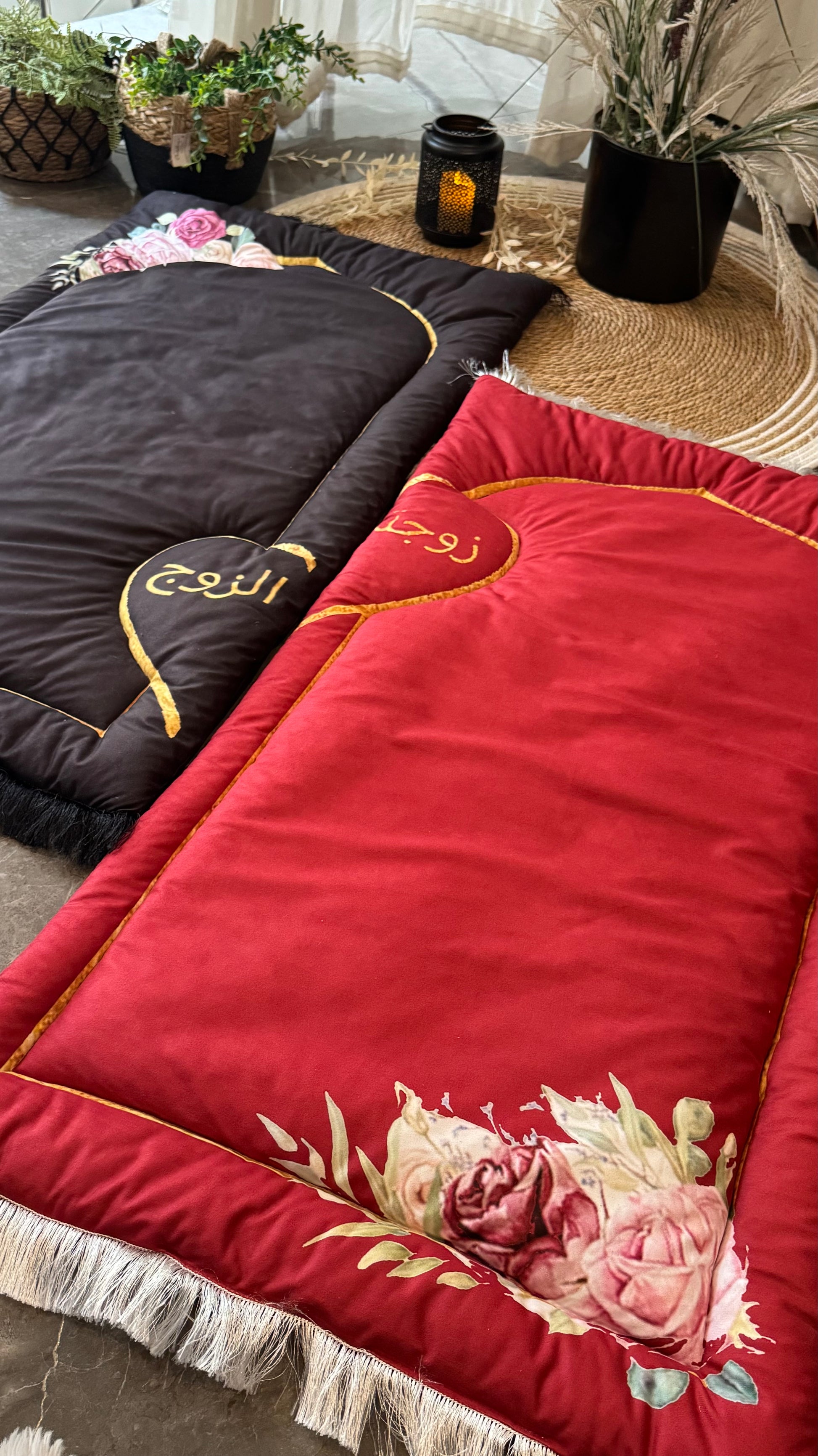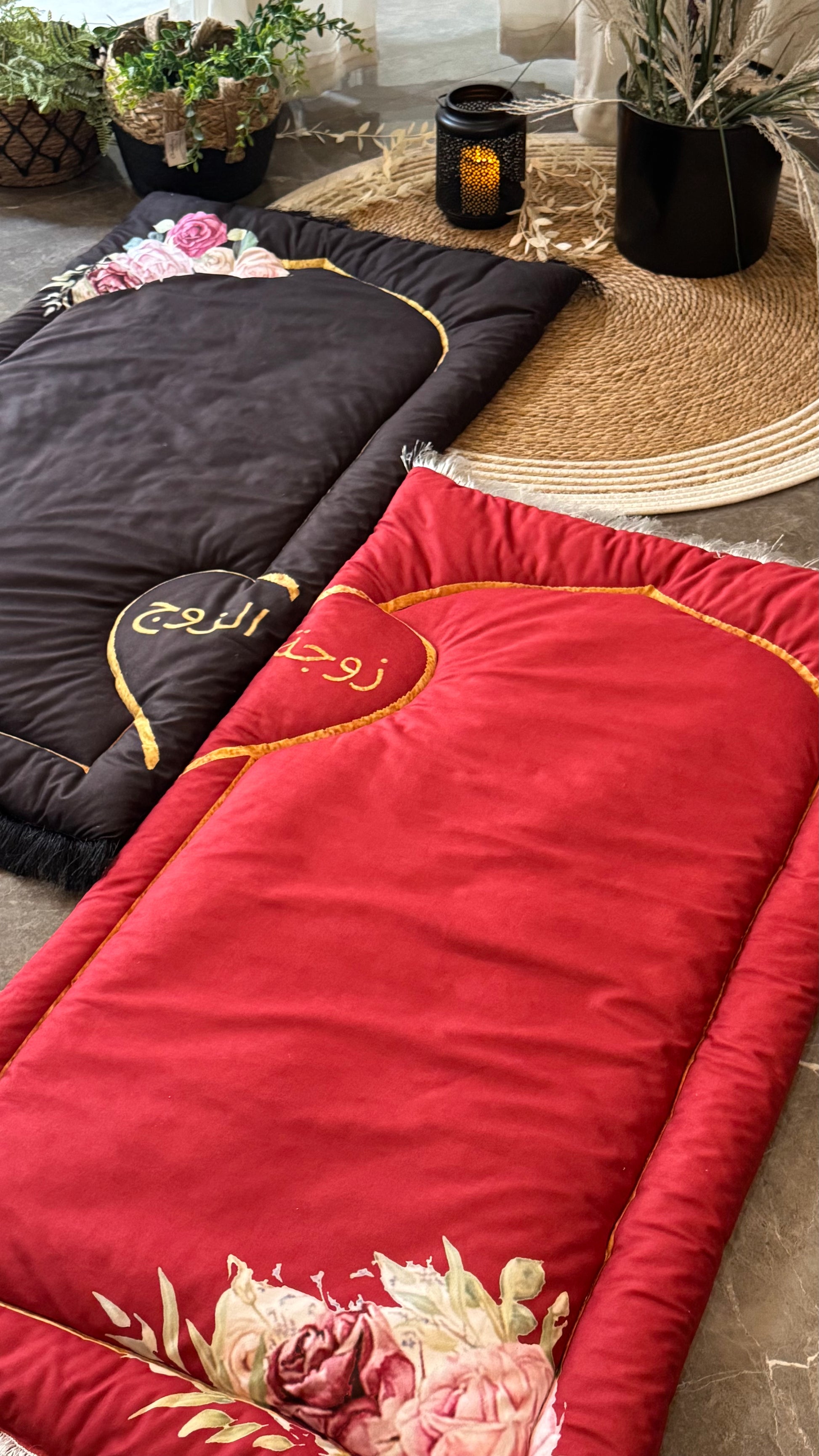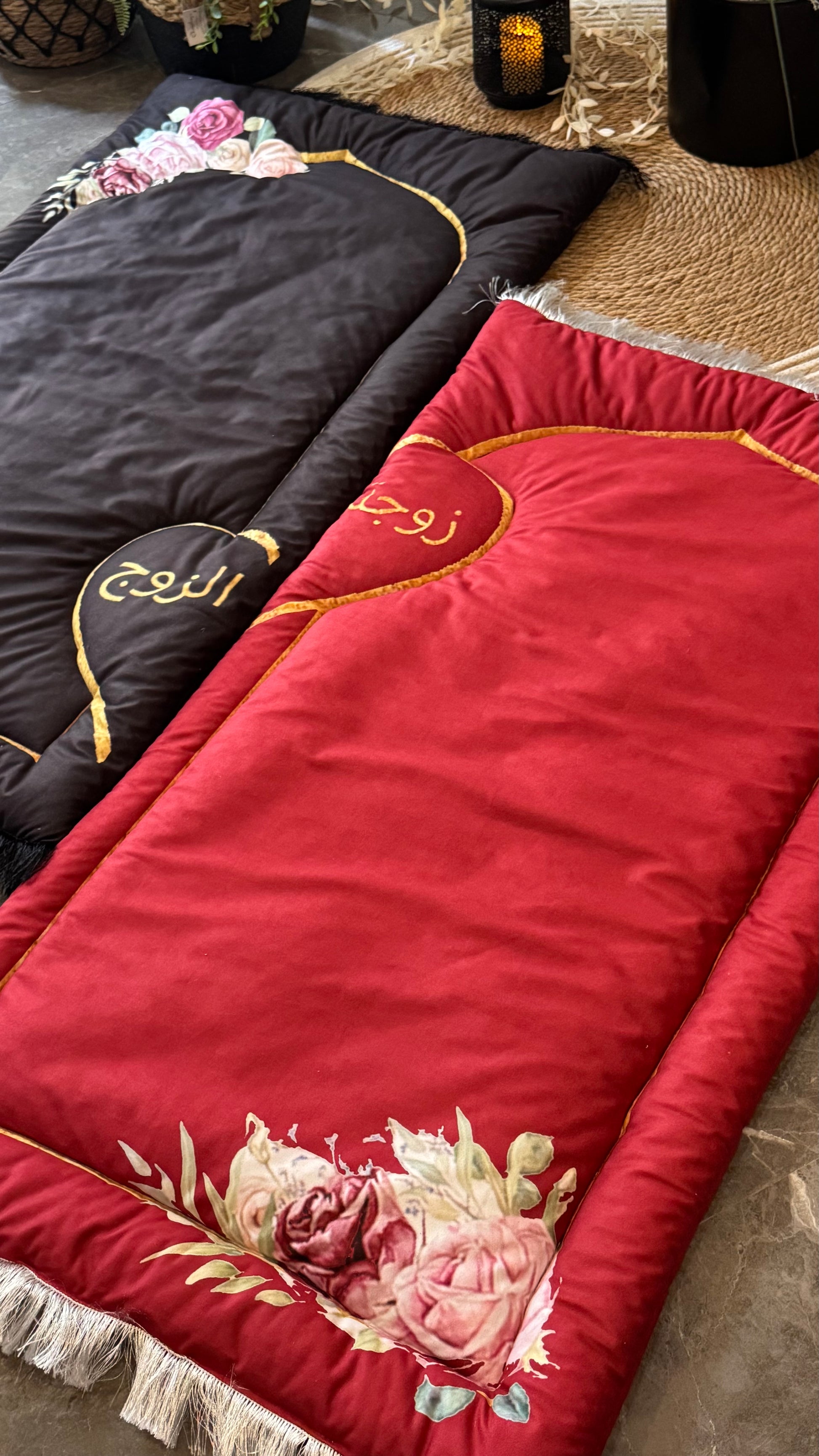 • Elegant Embroidery: Beautifully embroidered with golden Arabic calligraphy – “زوج” (Husband) on the black mat and “زوجة” (Wife) on the red mat – creating a perfect symbolic duo.