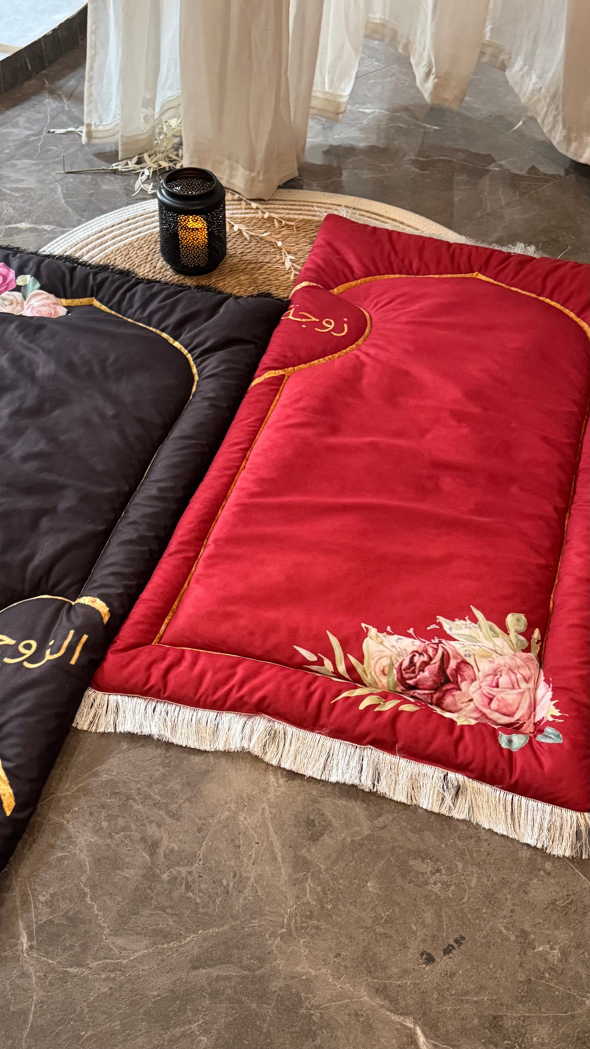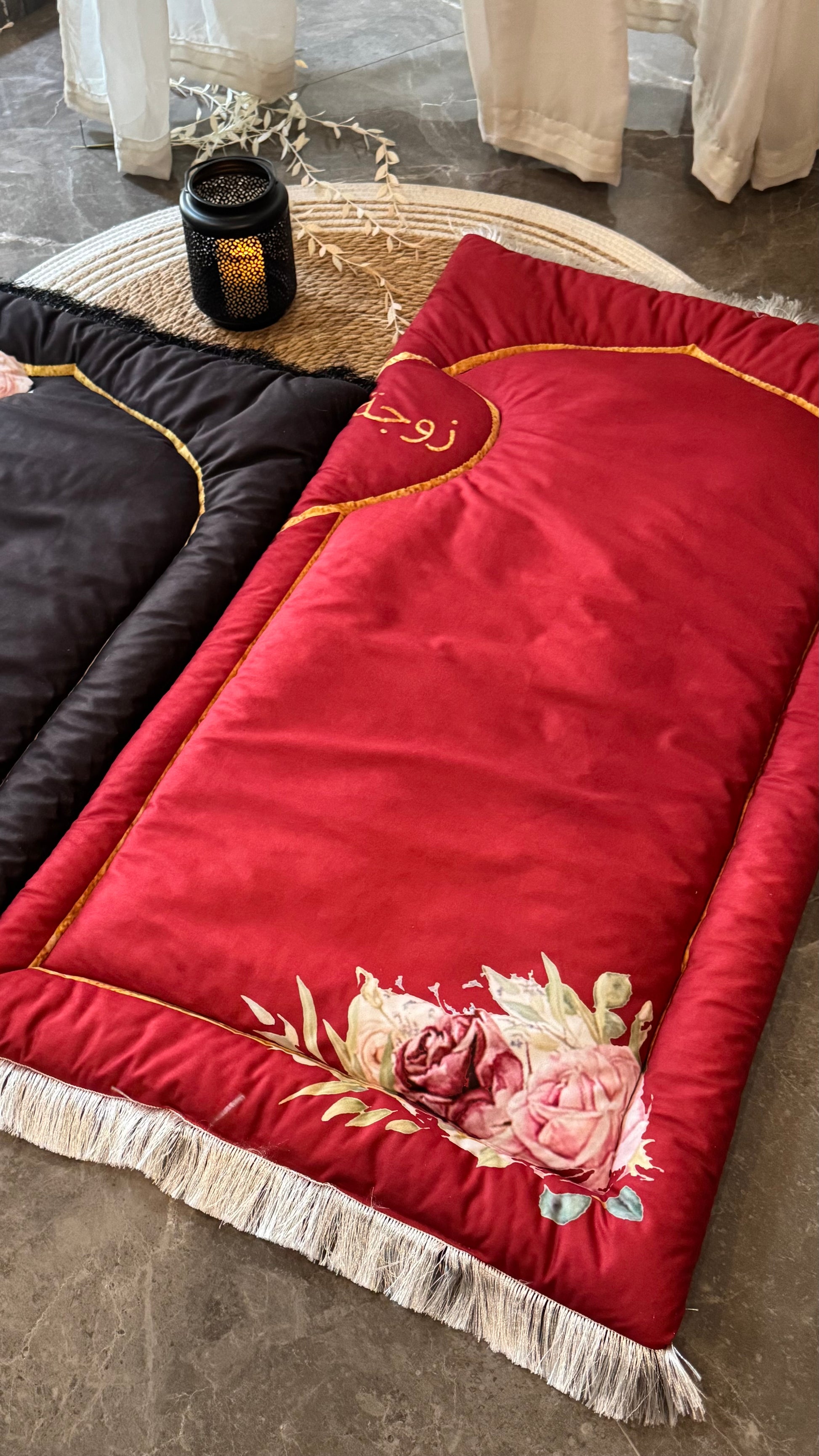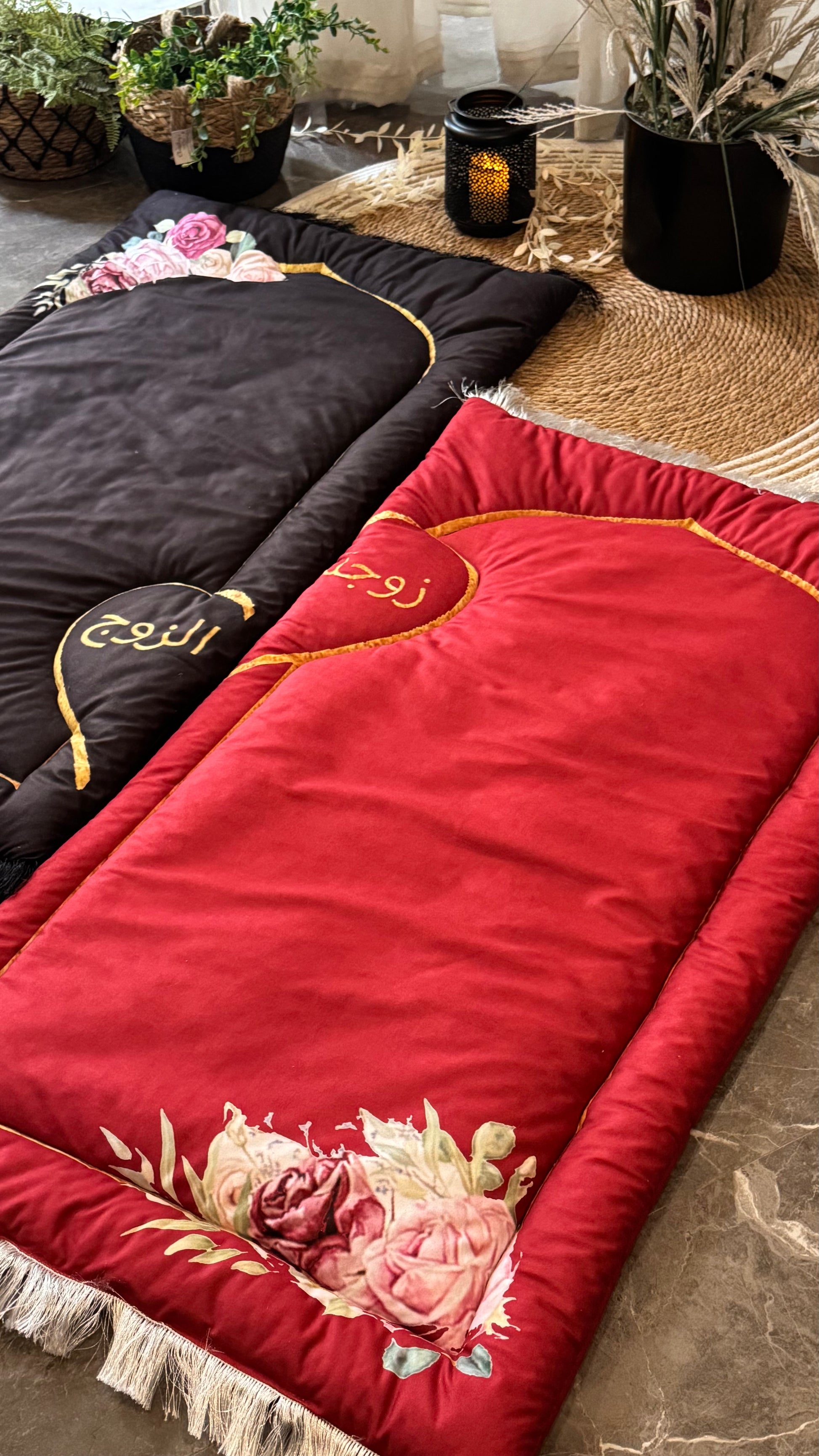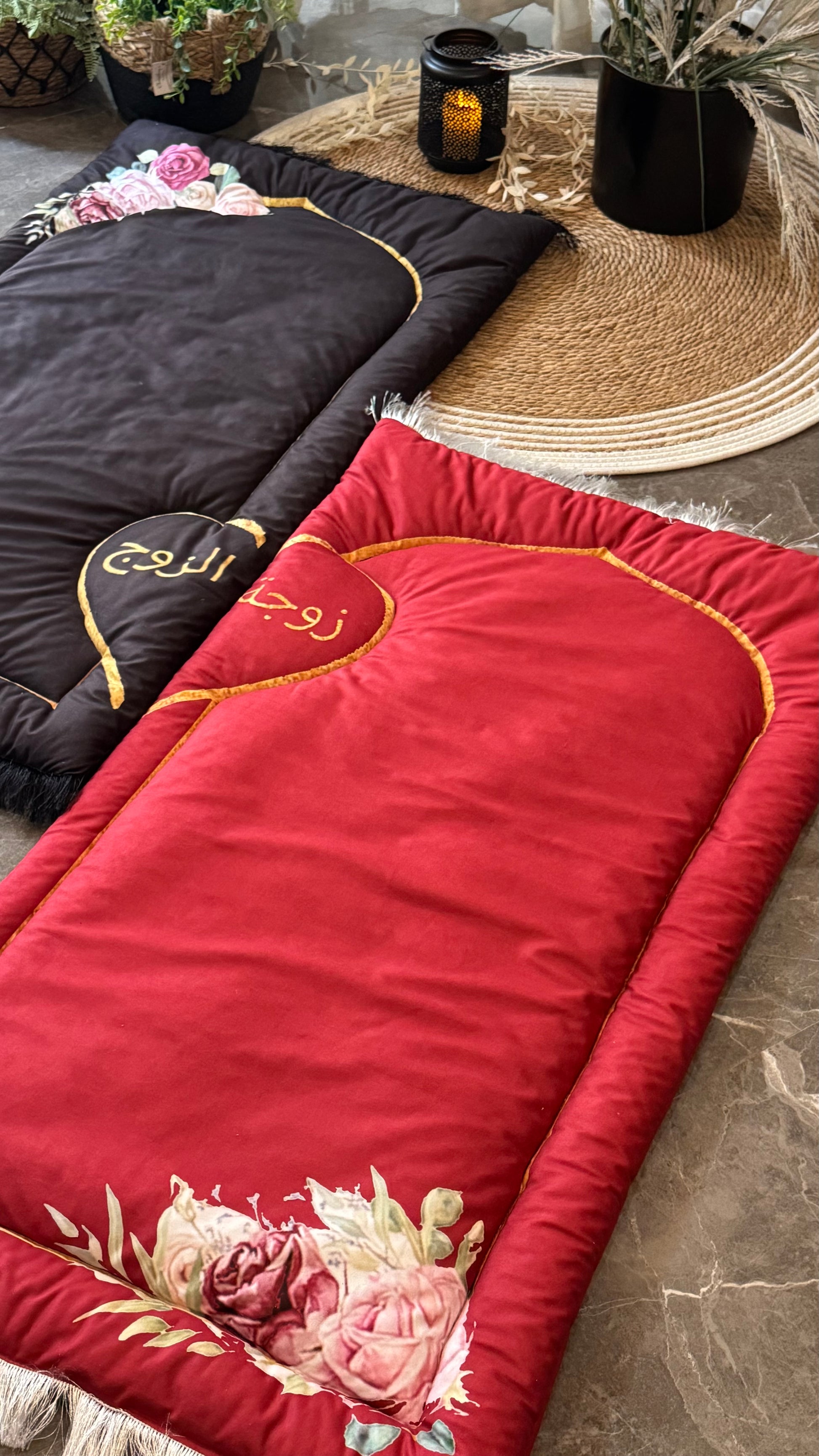 • Elegant Embroidery: Beautifully embroidered with golden Arabic calligraphy – “زوج” (Husband) on the black mat and “زوجة” (Wife) on the red mat – creating a perfect symbolic duo.