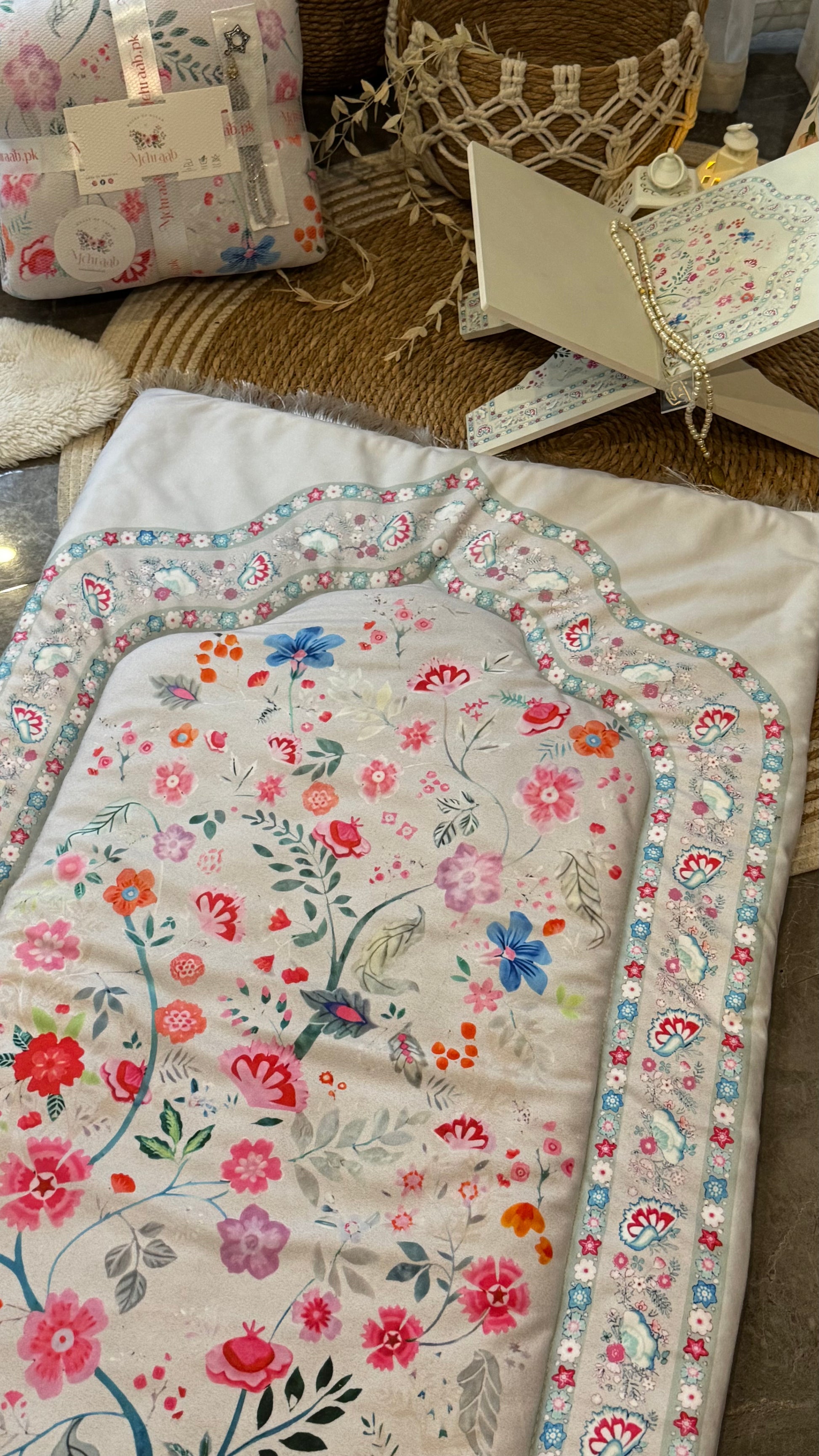 Noor-e-Gul – Ivory Blush blessing bundle( prayer mat,Rehal tasbeeh & bookmark)