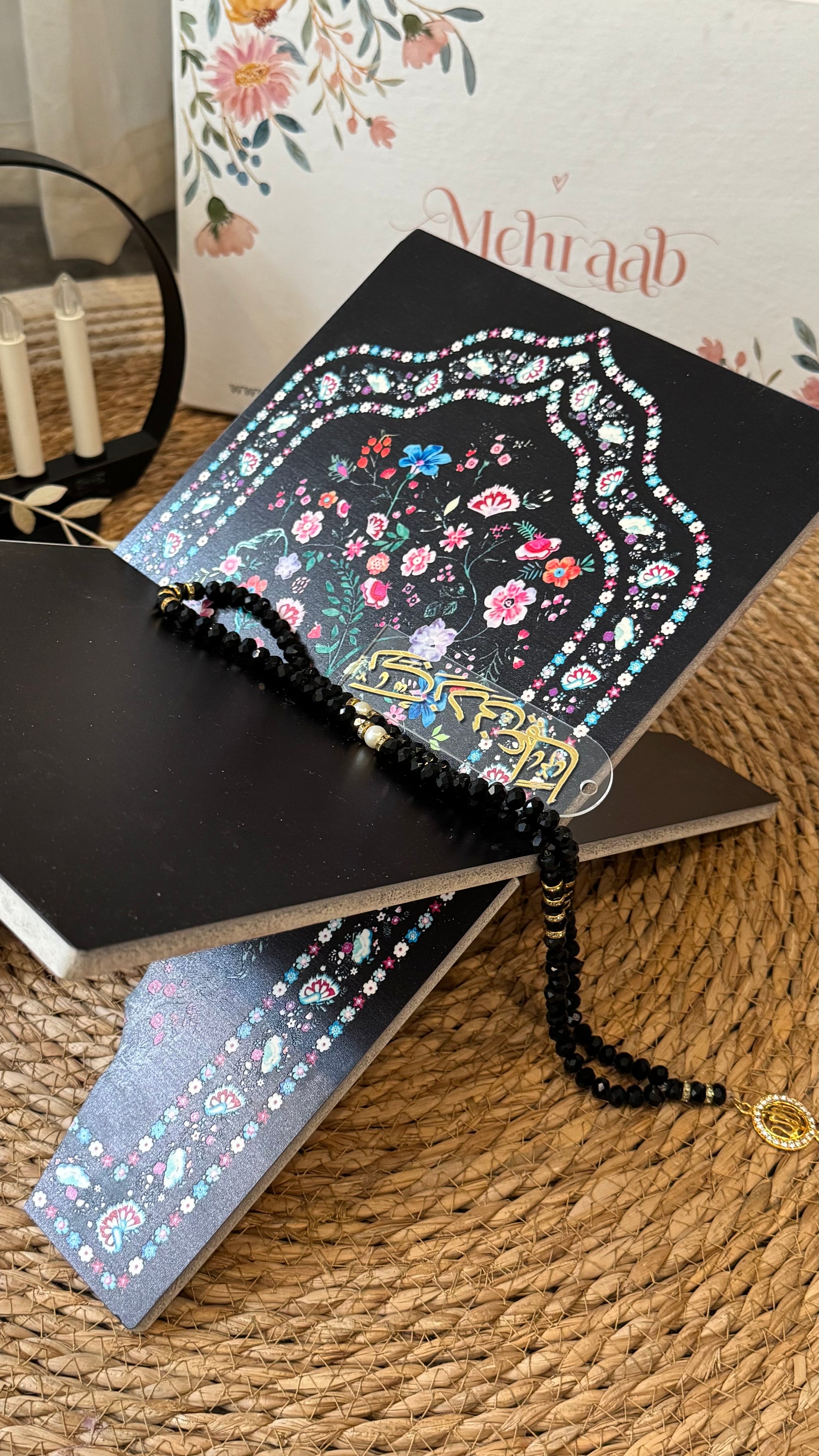 The customized large prayer mat is crafted with premium quality materials, offering exceptional comfort and ample space for prayer. Personalization adds a special touch, making your ibadah even more heartfelt. The matching Rehal enhances your Quran recitation, while the tasbeeh and bookmark, designed in the same elegant style, complete the set beautifully.