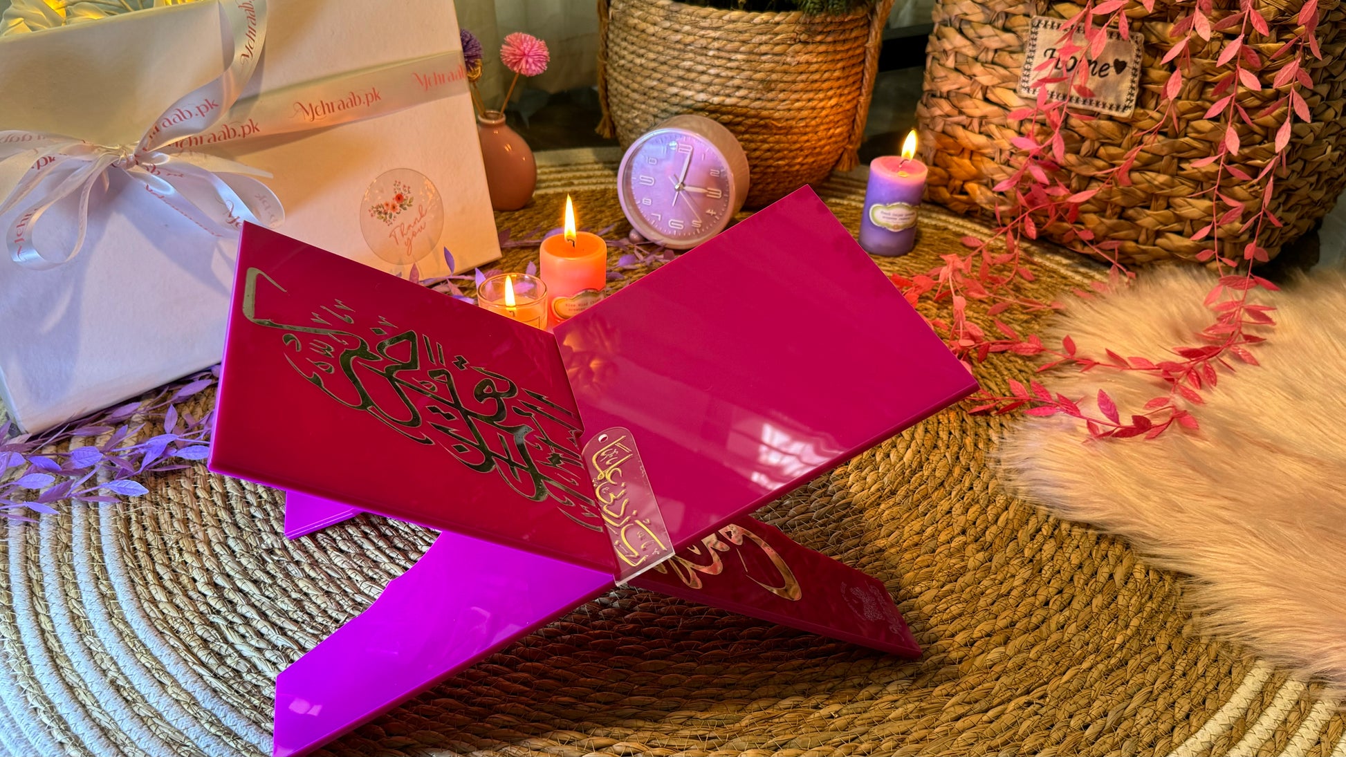 the Acrylic Pink Color Rehal! πΈπ Available in dimensions of 15*9 inches with a thickness of 6mm, each rehal comes in a beautiful box packaging. Perfect for personal use or as a thoughtful gift, this elegant and functional addition is sure to impress.