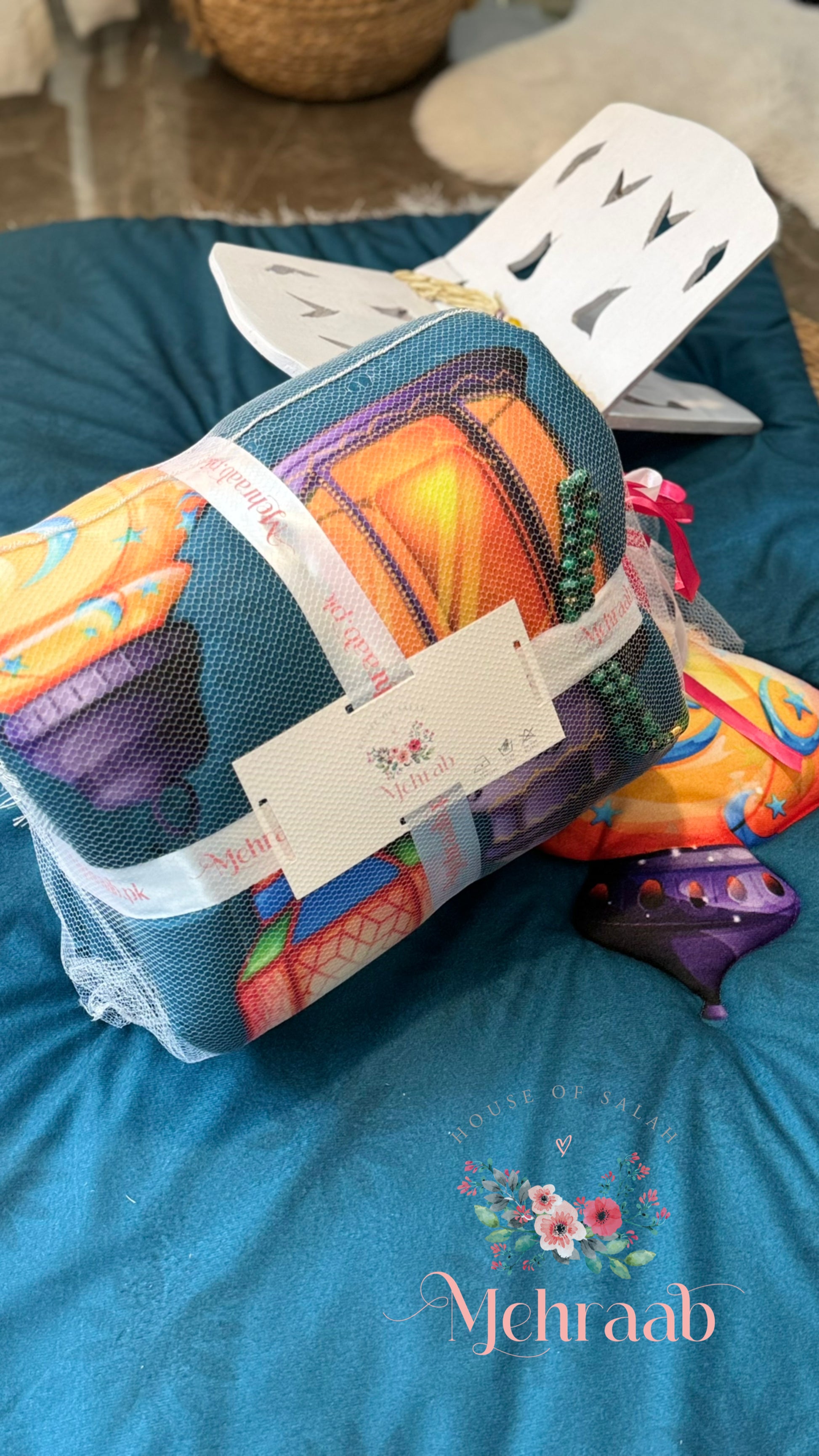 A radiant janamaz for kids in teal blue with lanterns. Loved by discerning youngsters. The bold color goes well with dark colored furniture.