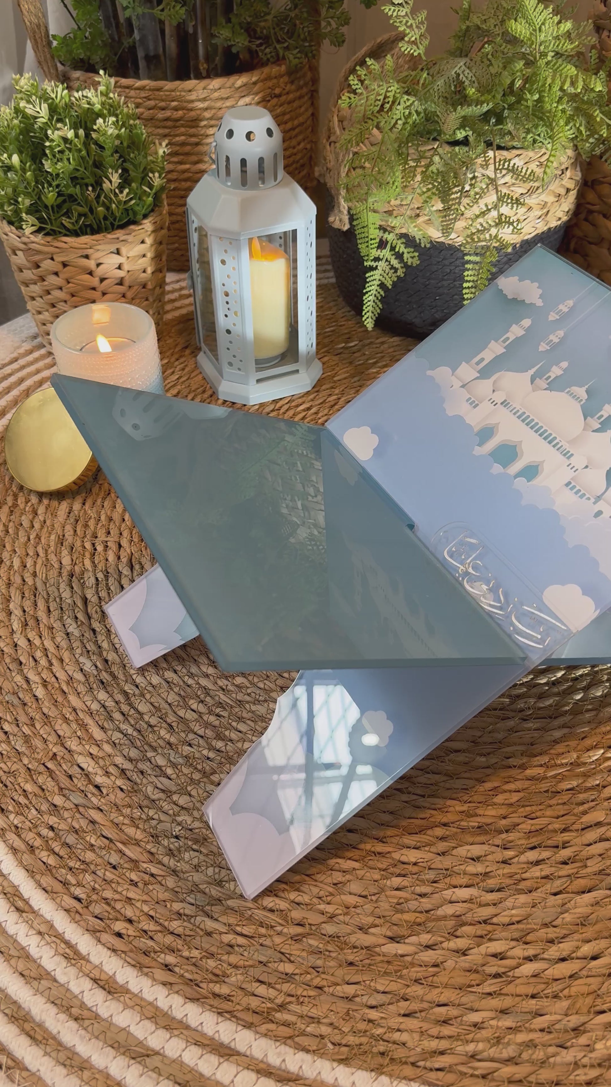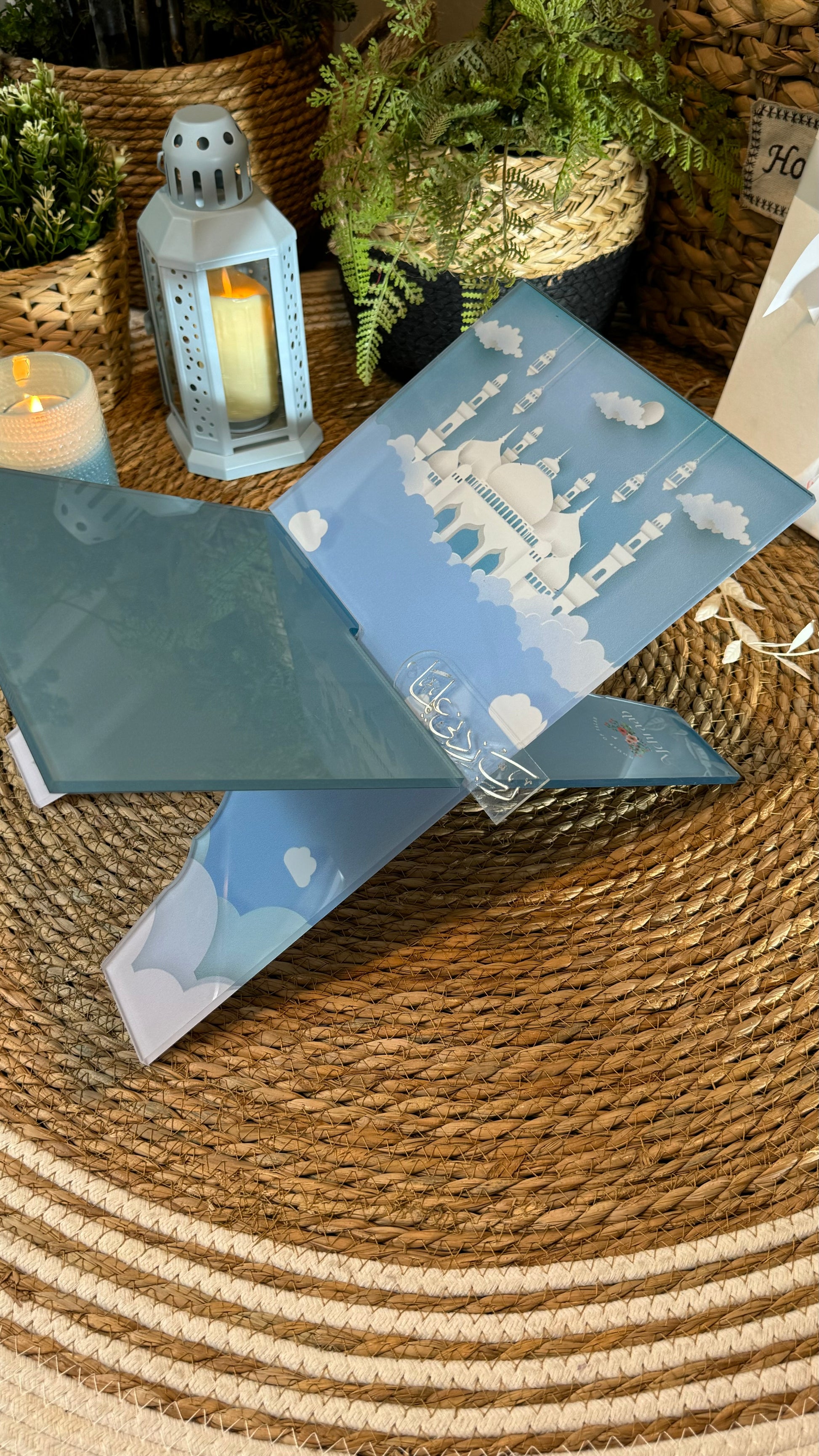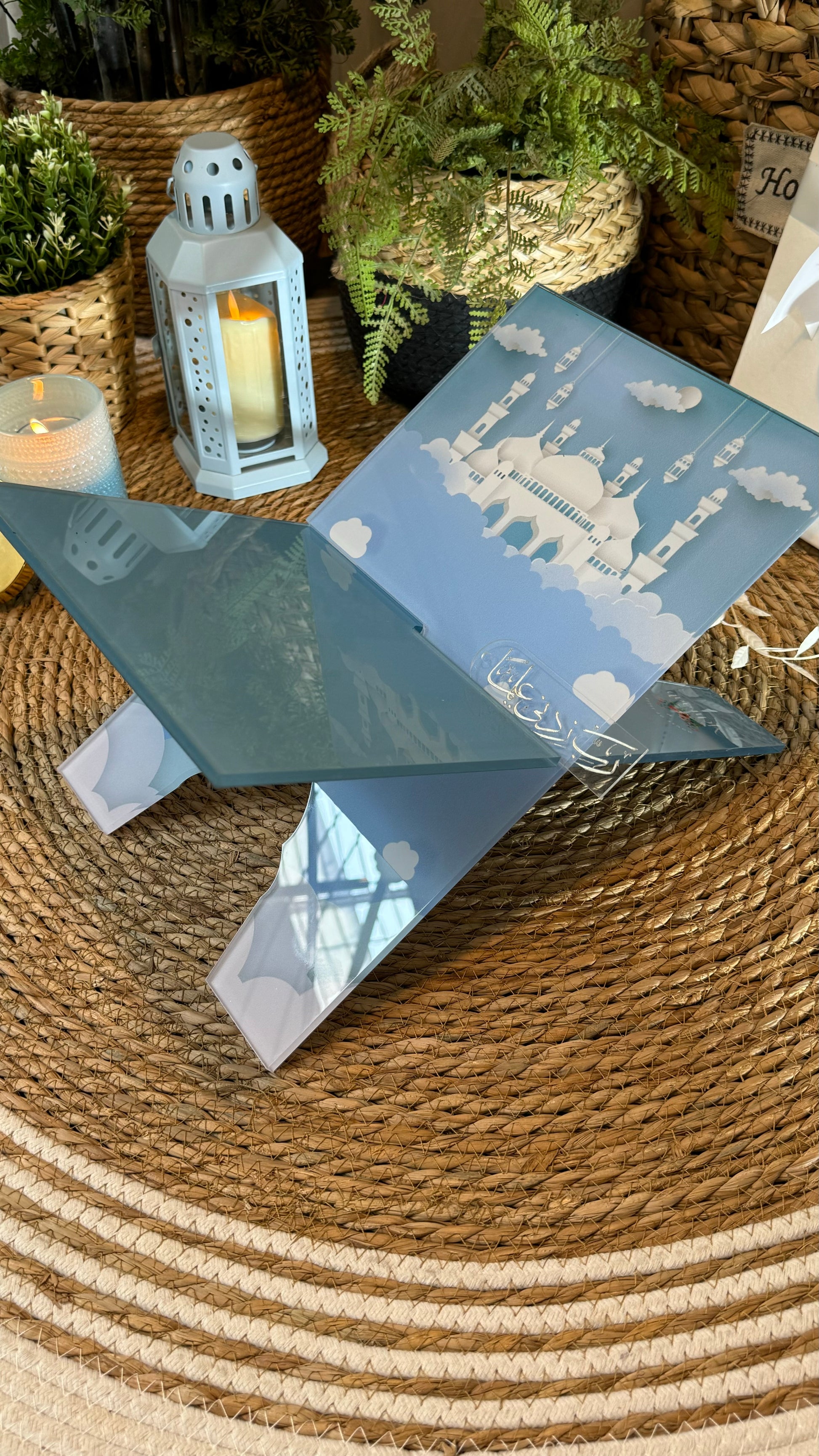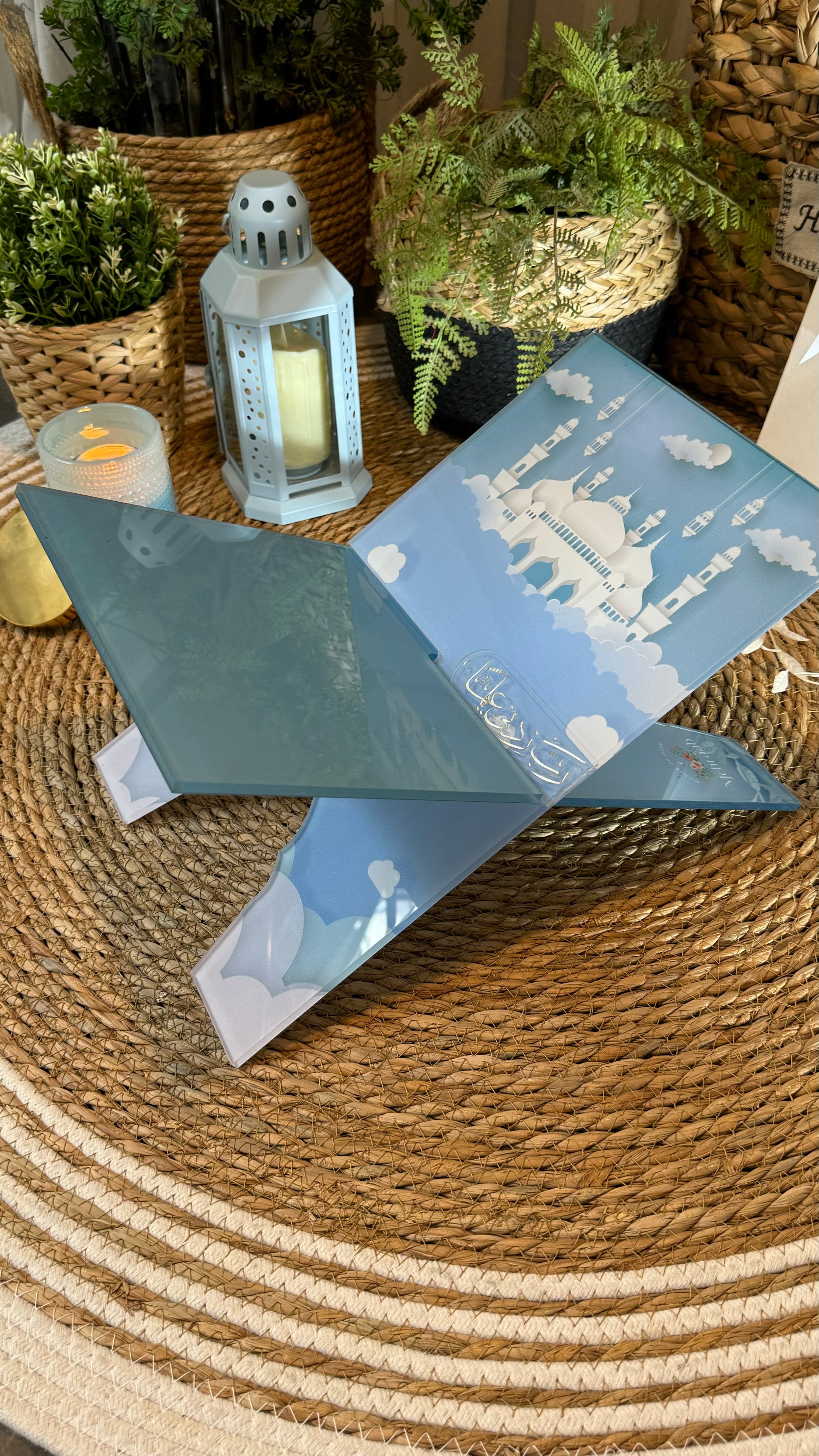 RK13:Sky blue Rehal/Quran holder white mosque on clouds.