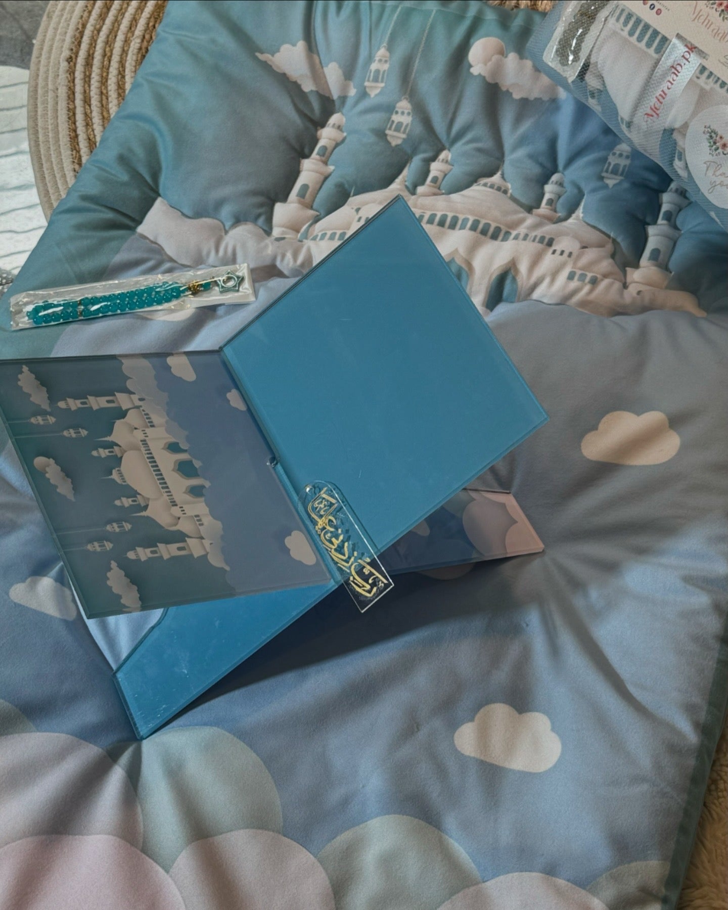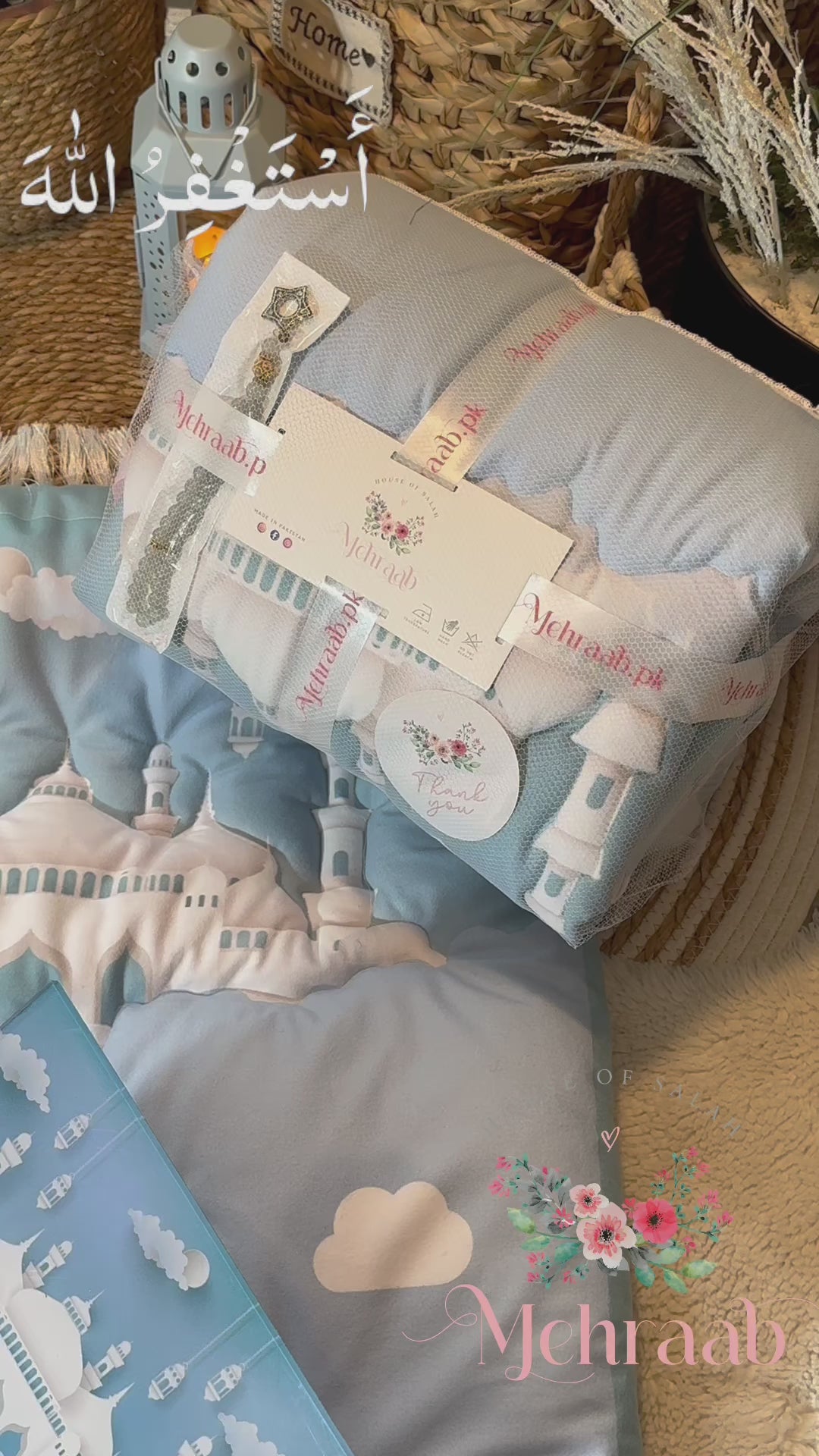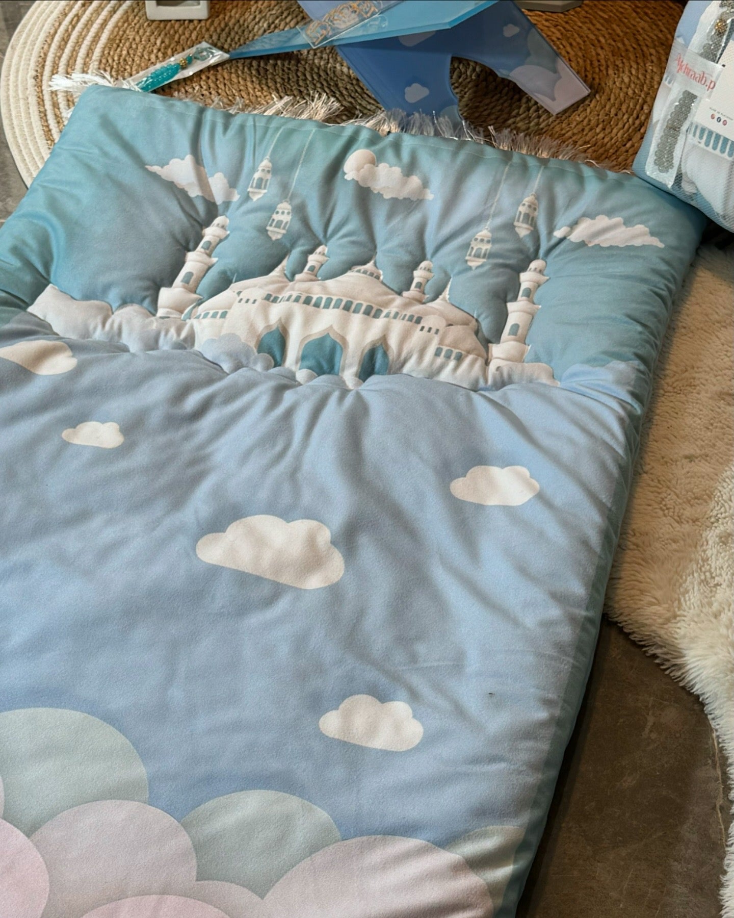 A white mosque illustrated on a sky blue prayer mat to bring focus to prayers. Goes well in rooms with dark colored furniture.