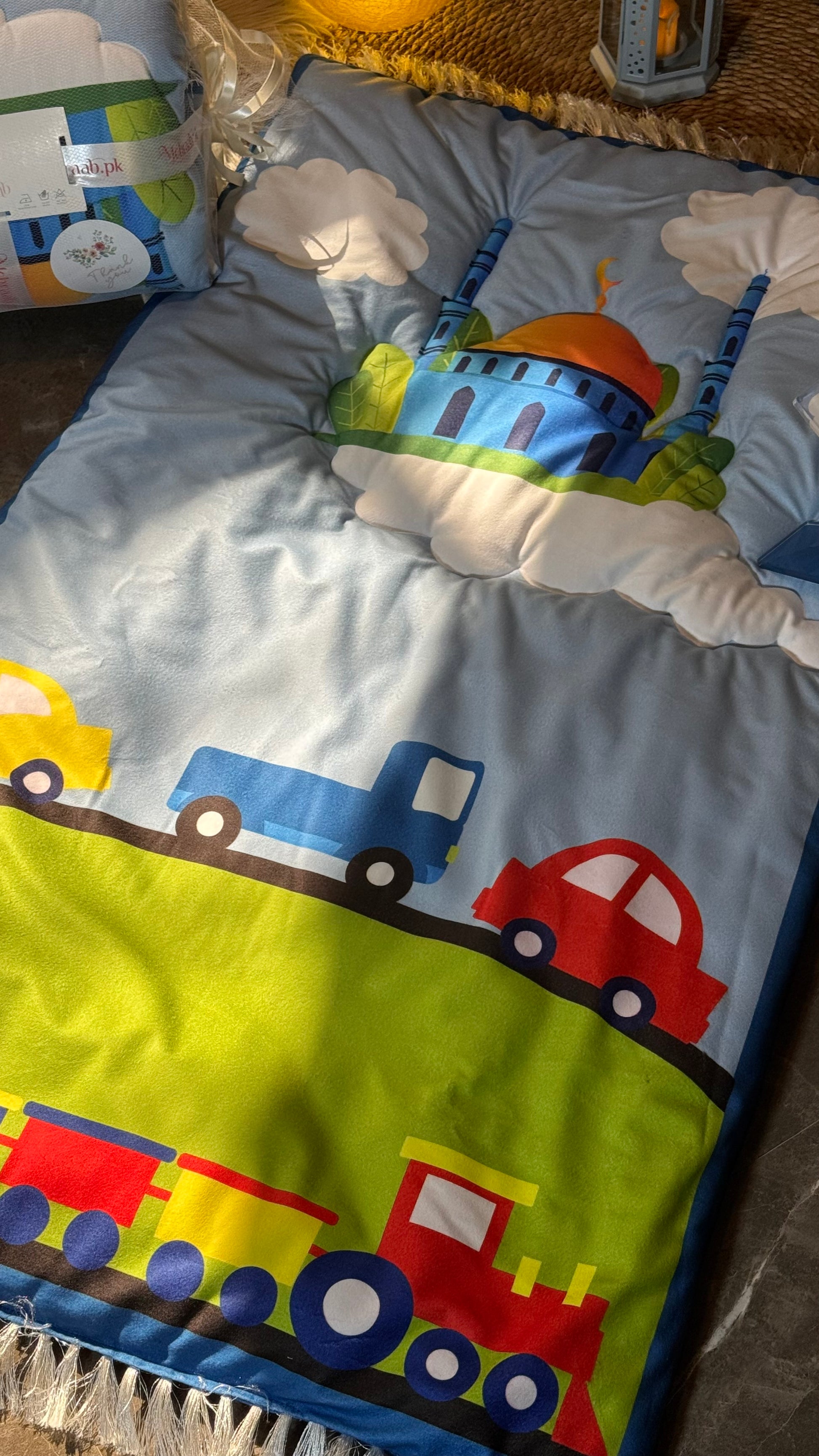 K08:Sky blue prayer mat with colorful cars and a mosque on clouds
