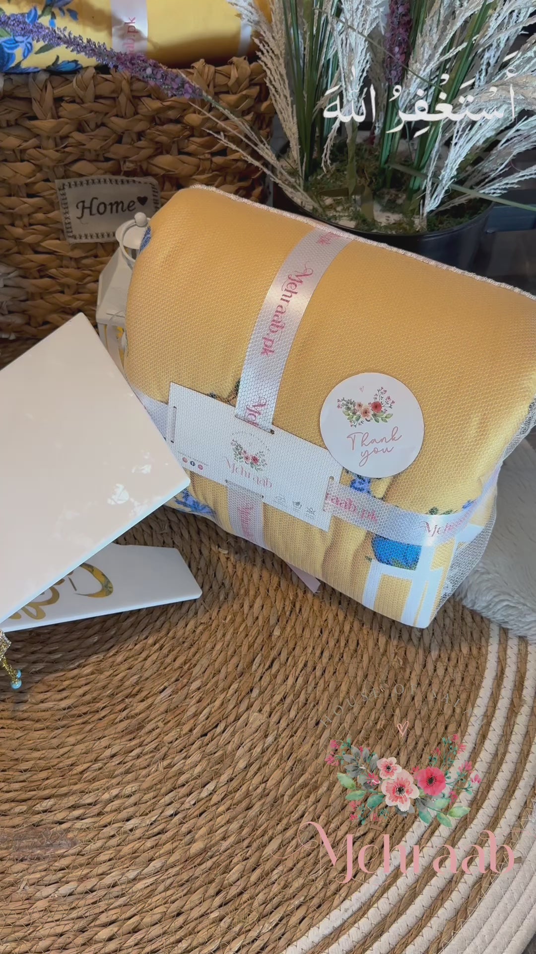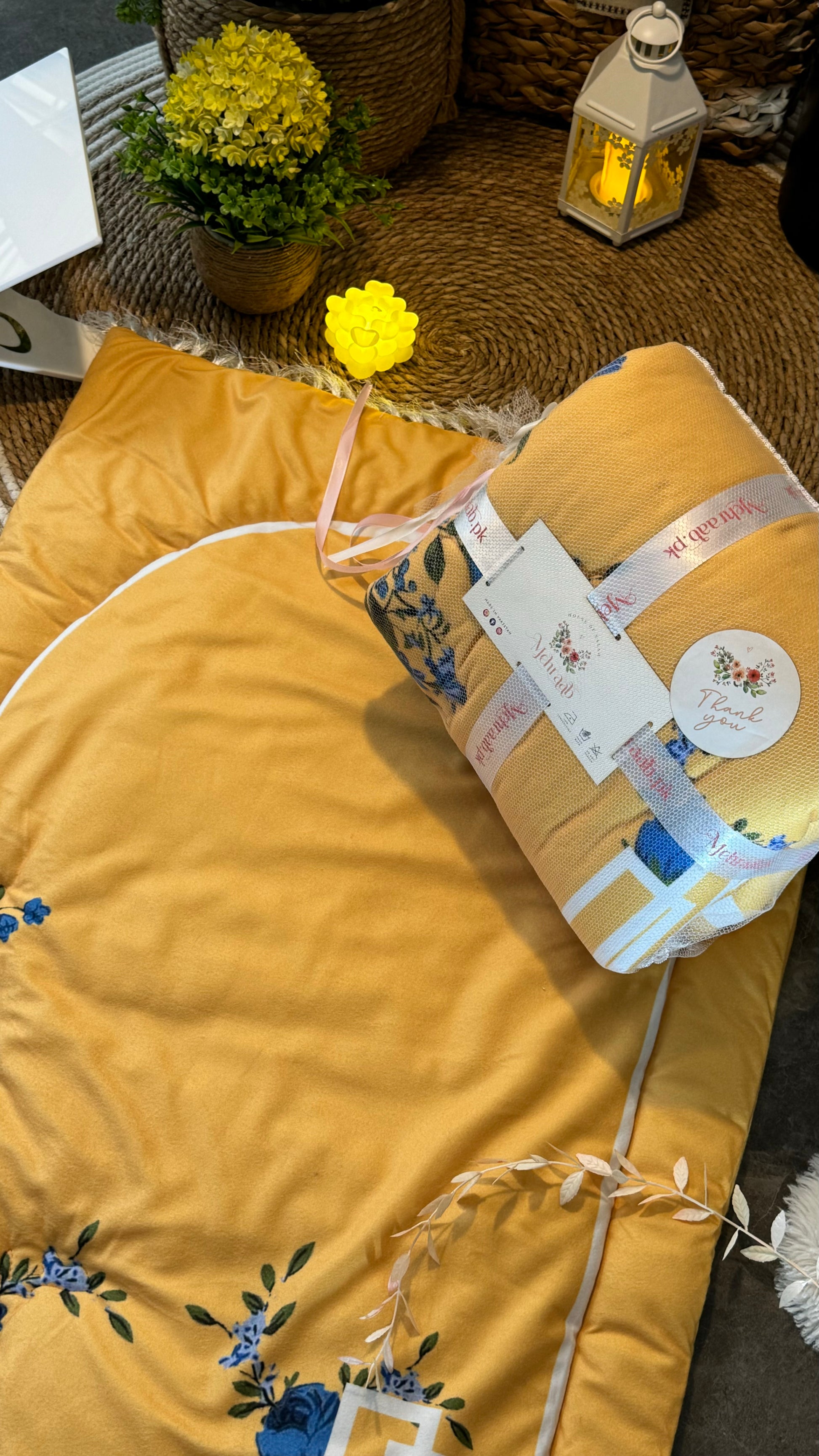 yellow mustard adult-size prayer mat! 🌼 Featuring a beautiful blue floral bunch design, this elegant mat is made with imported Korean velvet for a luxurious feel. It includes 300grs polyester filling and high-quality stitching, ensuring comfort and durability. Perfectly packaged for gifting or personal use. Elevate your prayer experience with this stunning addition!✨