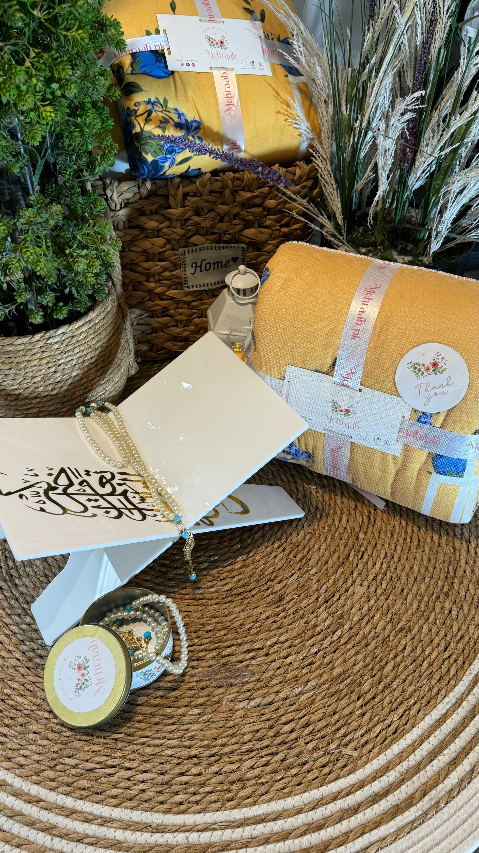 Ad16:Yellow mustard prayer mat/jayenamaz with blue floral bunch.